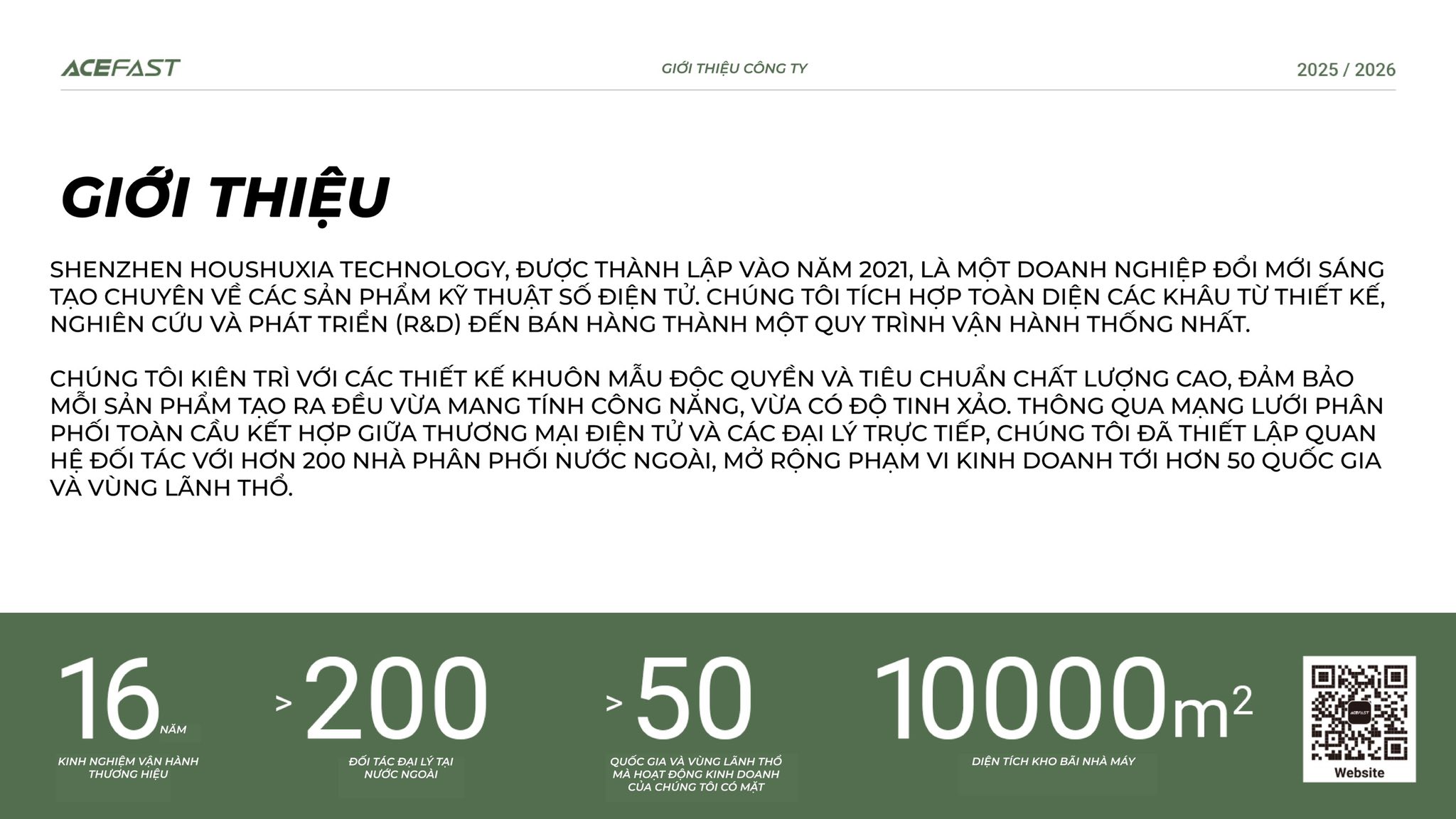 ACEFAST là thương hiệu phụ kiện công nghệ đến từ Trung Quốc, thuộc công ty Shenzhen Houshuxia Technology Co., Ltd, được thành lập năm 2020. Thương hiệu tập trung vào việc nghiên cứu, thiết kế và sản xuất các sản phẩm phụ kiện điện tử thông minh cho thiết bị di động và đời sống số hiện đại.