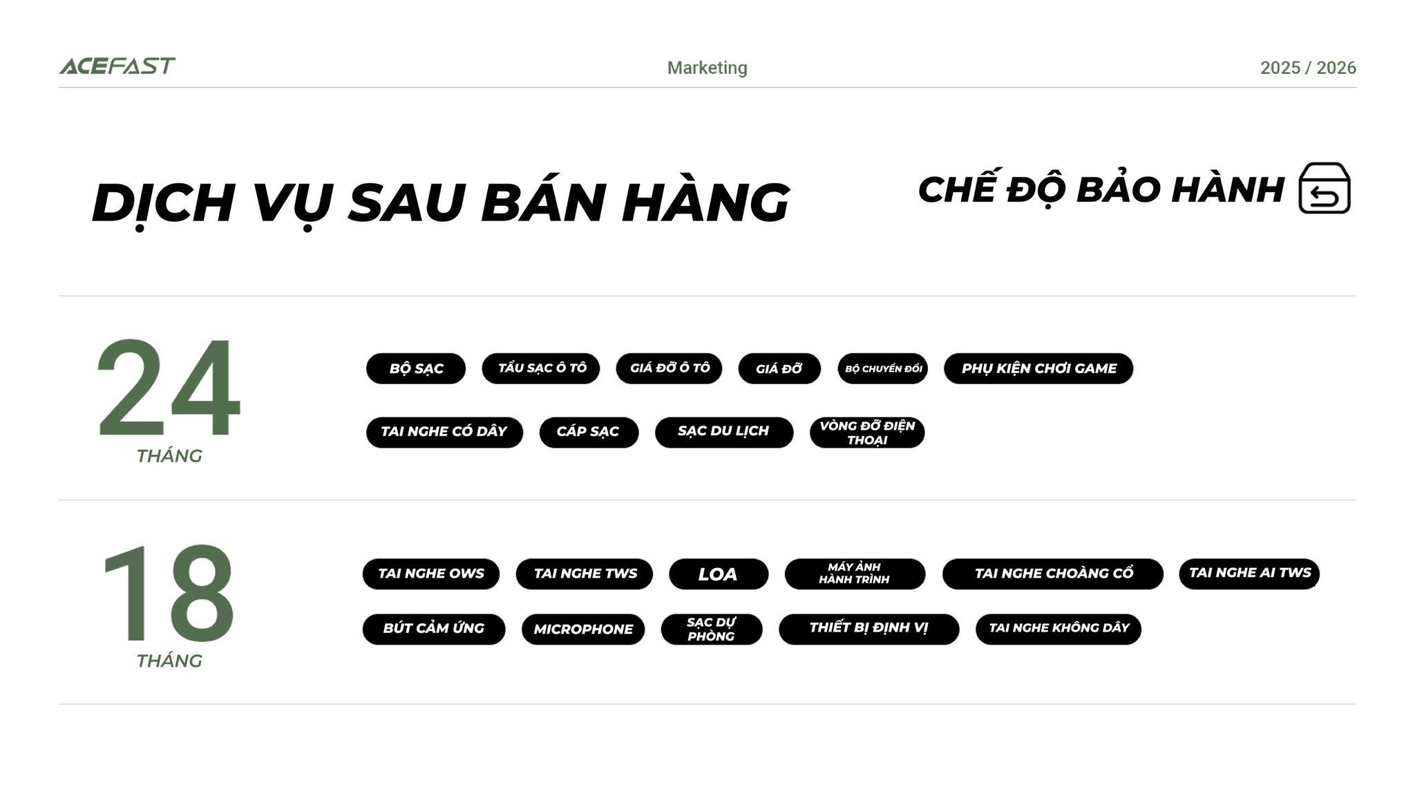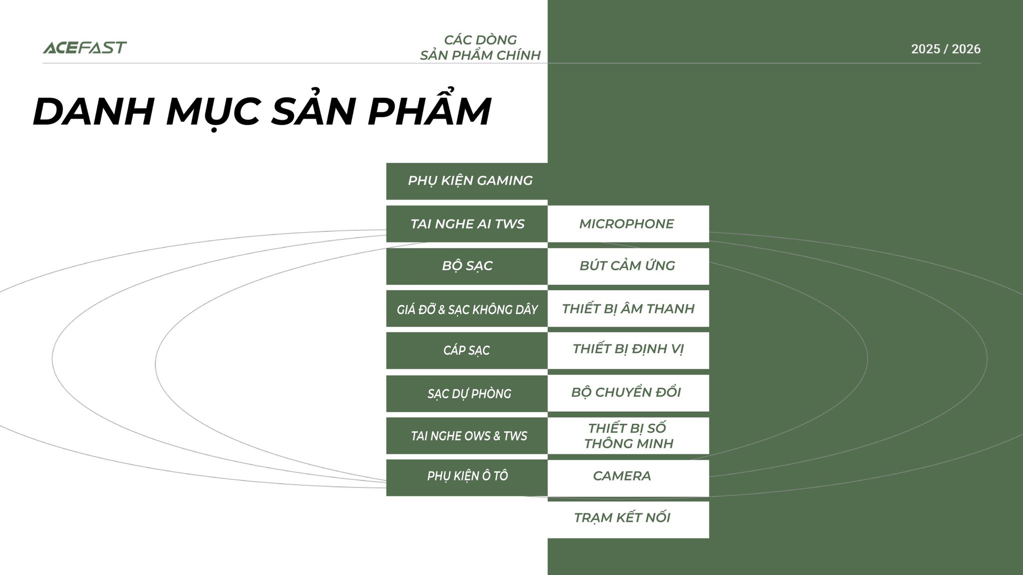 Danh mục sản phẩm của ACEFAST rất đa dạng, bao gồm: