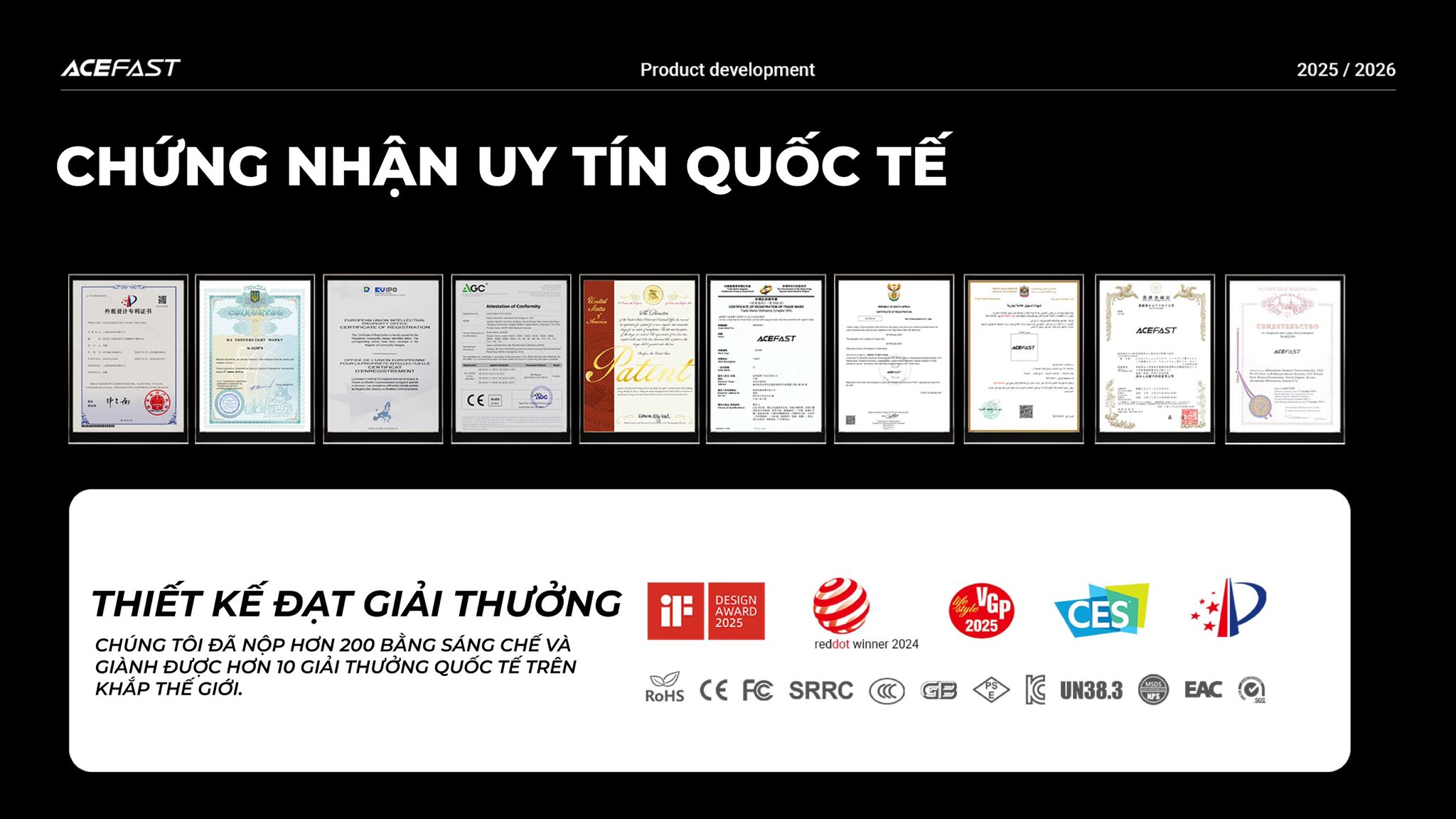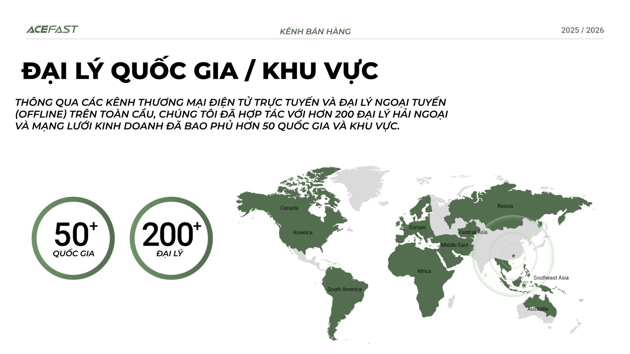 Hiện nay, các sản phẩm ACEFAST đã được phân phối tại nhiều thị trường trên thế giới thông qua các nền tảng thương mại điện tử và hệ thống bán lẻ, với nhiều chứng nhận quốc tế như CE, FCC, RoHS, PSE nhằm đảm bảo tiêu chuẩn an toàn và chất lượng.