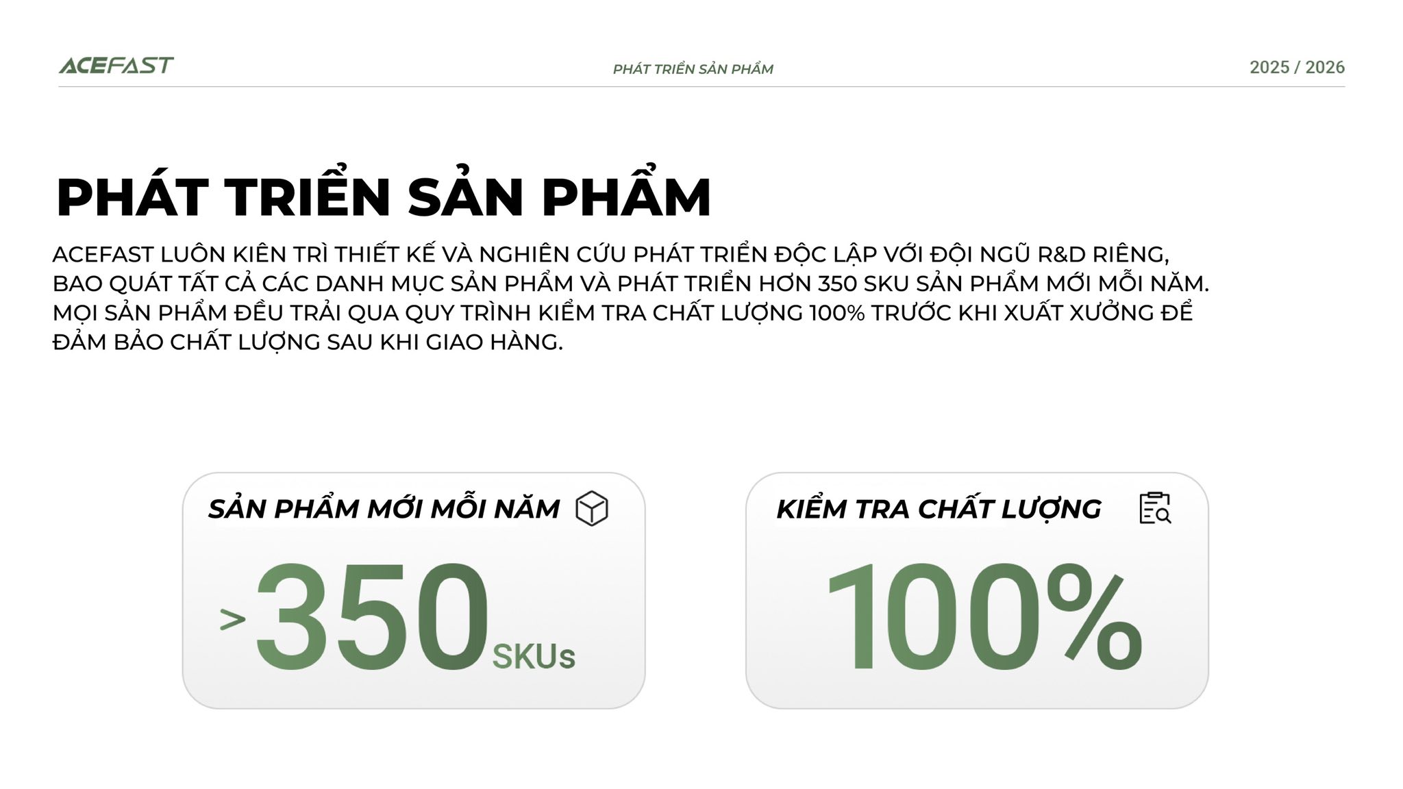 Với triết lý phát triển dựa trên chất lượng, công nghệ và trải nghiệm người dùng, ACEFAST đang từng bước trở thành một trong những thương hiệu phụ kiện công nghệ được người dùng trẻ trên toàn cầu ưa chuộng.