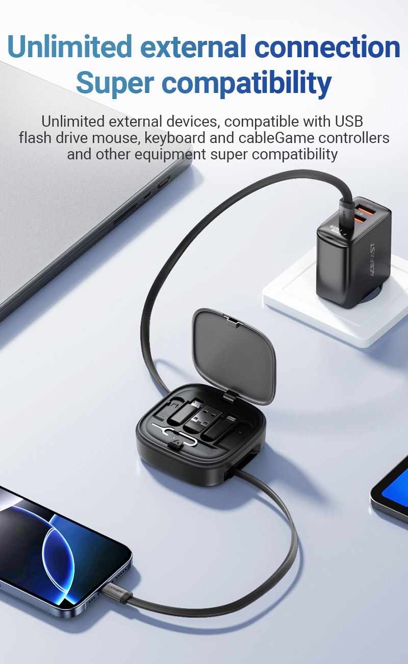 Tích hợp nhiều đầu chuyển – sạc nhanh + truyền dữ liệu + khe SIM/TF + chọc SIM + giá đỡ gập, tất cả trong một hộp du lịch tiện lợi