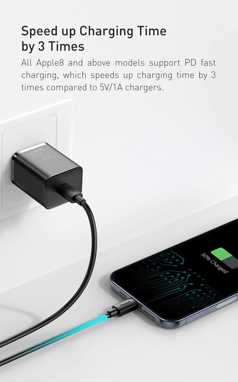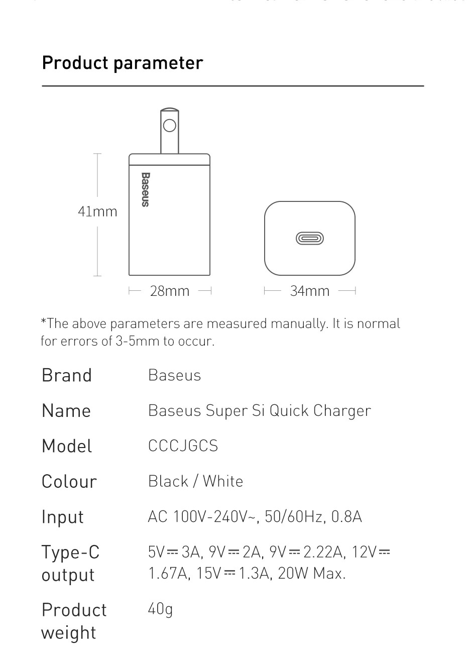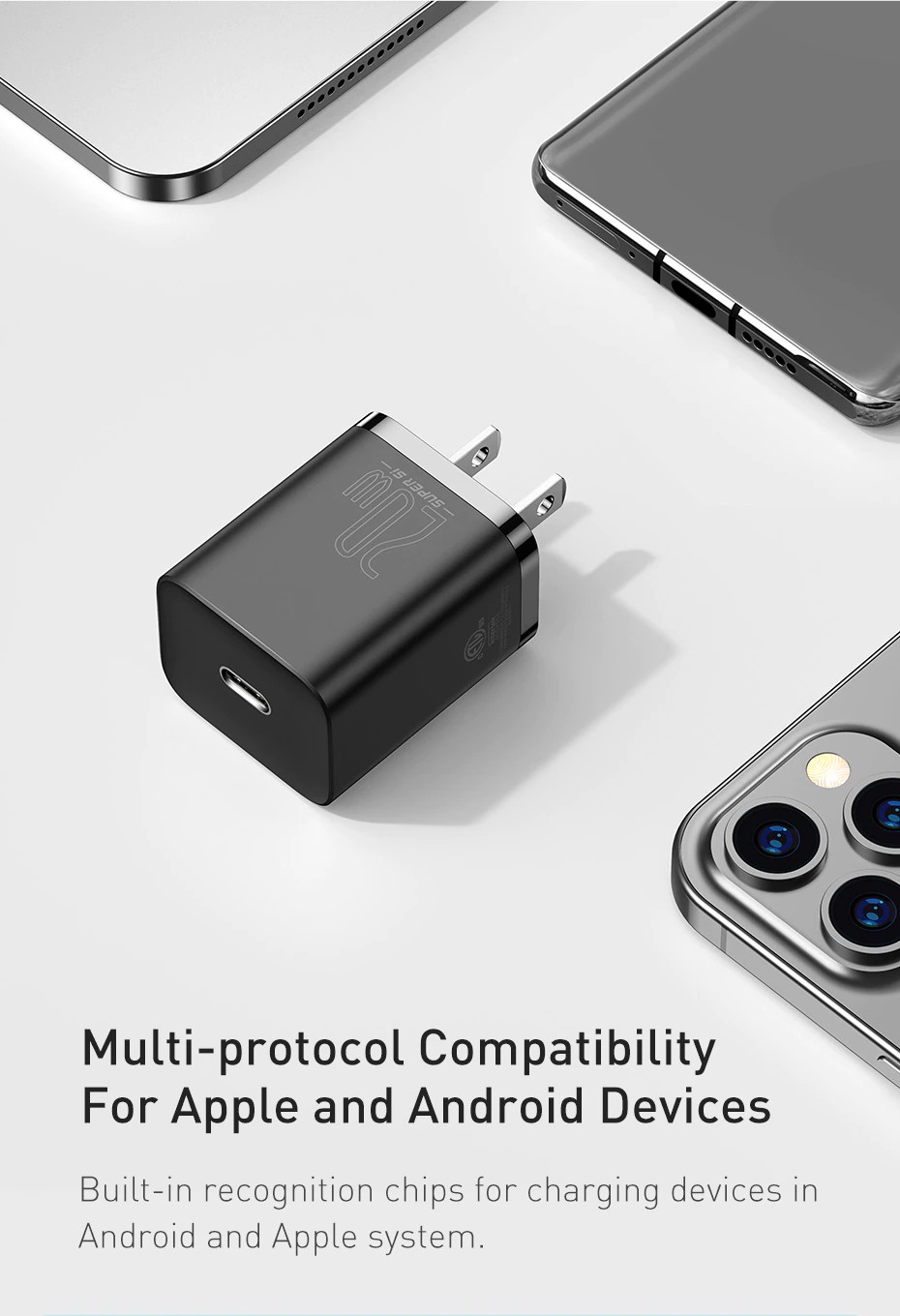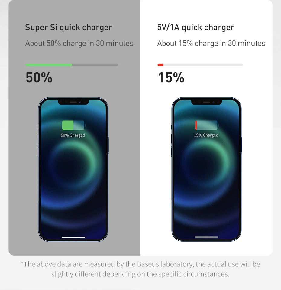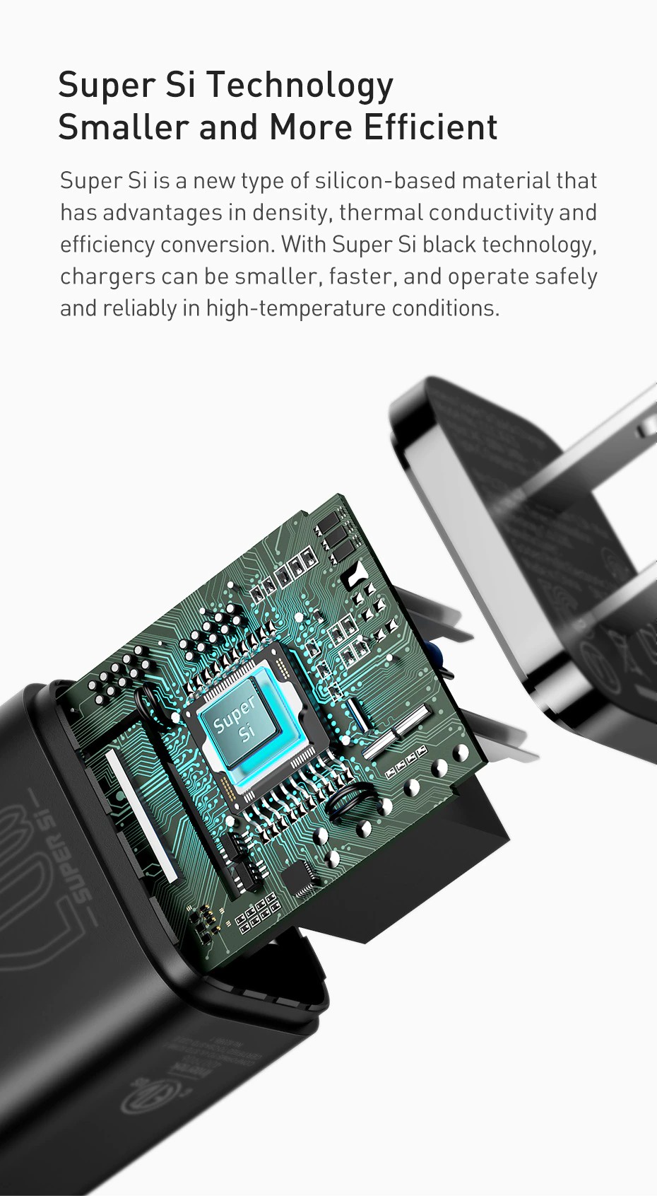 - Nhờ được trang bị công nghệ bán dẫn Super Si nên Bộ sạc nhanh đa năng Baseus Super Si Quick Charger 20W có thể hỗ trợ đồng thời các chuẩn sạc nhanh Power delivery và Quick charge 3.0 với công suất lên đến 20W nhưng với một kích thước vô cùng nhỏ gọn.