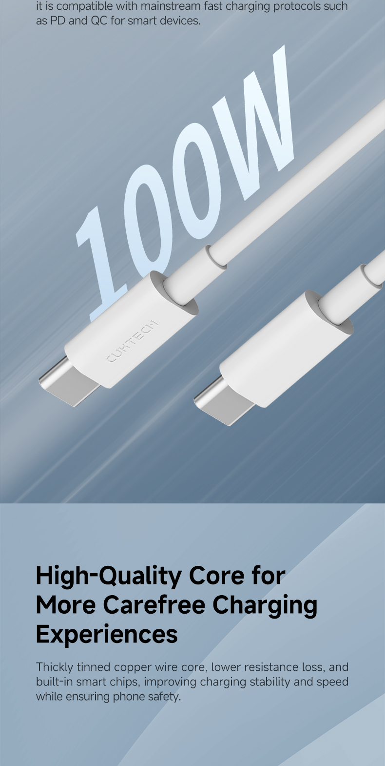 Điểm mạnh vượt trội của Cáp C to C CUKTECH CTC515N 1.5m 100W là khả năng tương thích rộng rãi với các giao thức sạc nhanh hàng đầu hiện nay như PD3.0, QC3.0, SCP, và FCP.