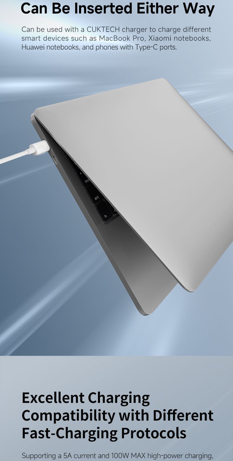 Cáp CUKTECH CTC515N được trang bị công nghệ sạc nhanh tiên tiến, hỗ trợ công suất lên đến 100W (20V/5A). Đây là mức công suất mạnh mẽ, đủ để nạp đầy năng lượng cho các thiết bị ngốn pin như laptop gaming, Mặc Bục Pro, máy tính bảng cao cấp hay điện thoại thông minh chỉ trong thời gian ngắn kỷ lục.