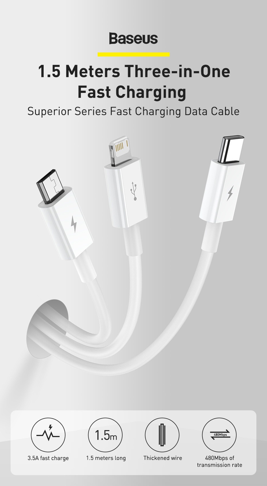 Hình ảnh chi tiết Cáp sạc 3 đầu Baseus Superior Series 3 in 1 (USB to Type C+ IP + Micro USB, 3.5A/ 1.5m, TPE Fast Charging Data Cable)