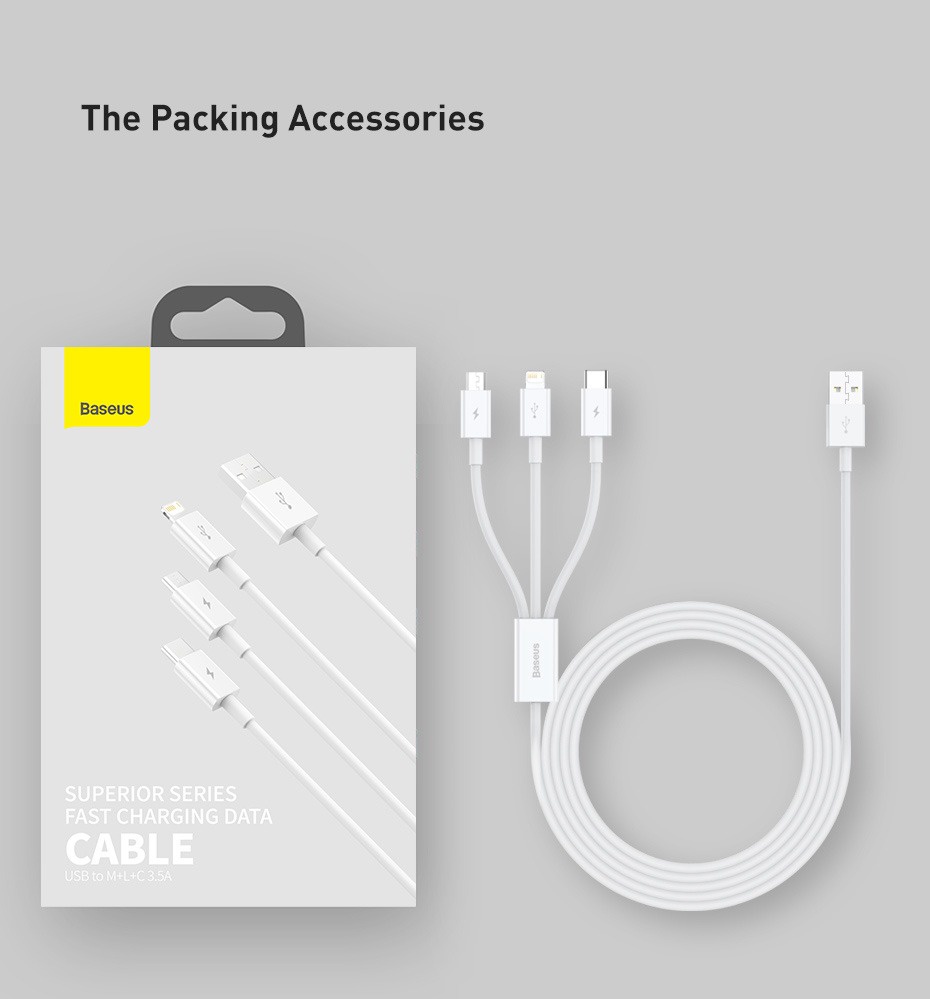 Giới thiệu sản phẩm Cáp sạc 3 đầu Baseus Superior Series 3 in 1 (USB to Type C+ IP + Micro USB, 3.5A/ 1.5m, TPE Fast Charging Data Cable)