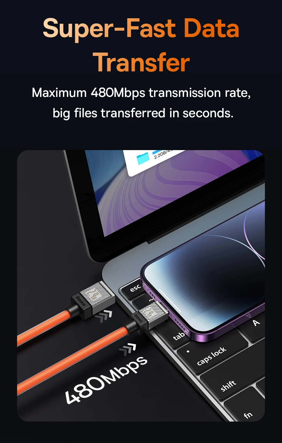 Dây cũng hỗ trợ tốc độ truyền tải dữ liệu lên đến 480mbps. Các dữ liệu như hình ảnh, tài liệu đều sẽ được truyền tải nhanh chóng mà không ảnh hưởng đến tốc độ sạc của thiết bị.