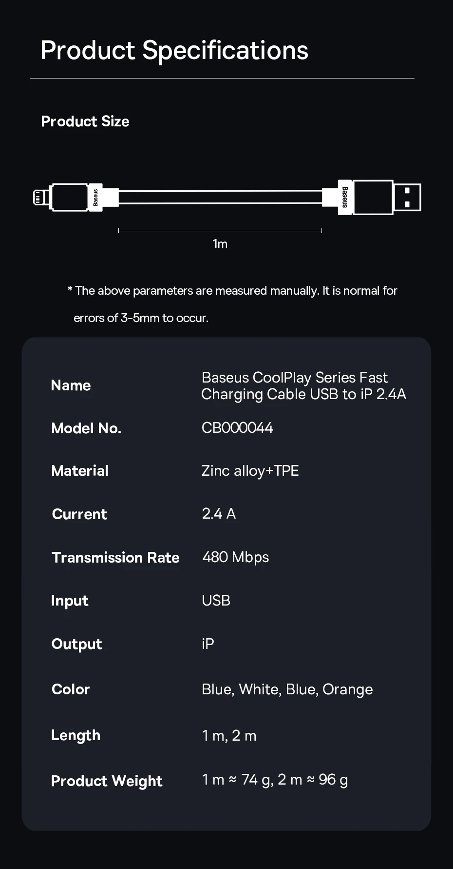 Sản phẩm CoolPlay Series Fast Charging Cable Type C to IP PD 20W của Baseus là một cáp sạc có thể sạc nhanh cho các thiết bị hỗ trợ sạc nhanh với đầu IP, với công suất 20/27W. Cáp sạc này sử dụng kết nối Type-C để kết nối với nguồn điện và đầu IP để kết nối với thiết bị của bạn.