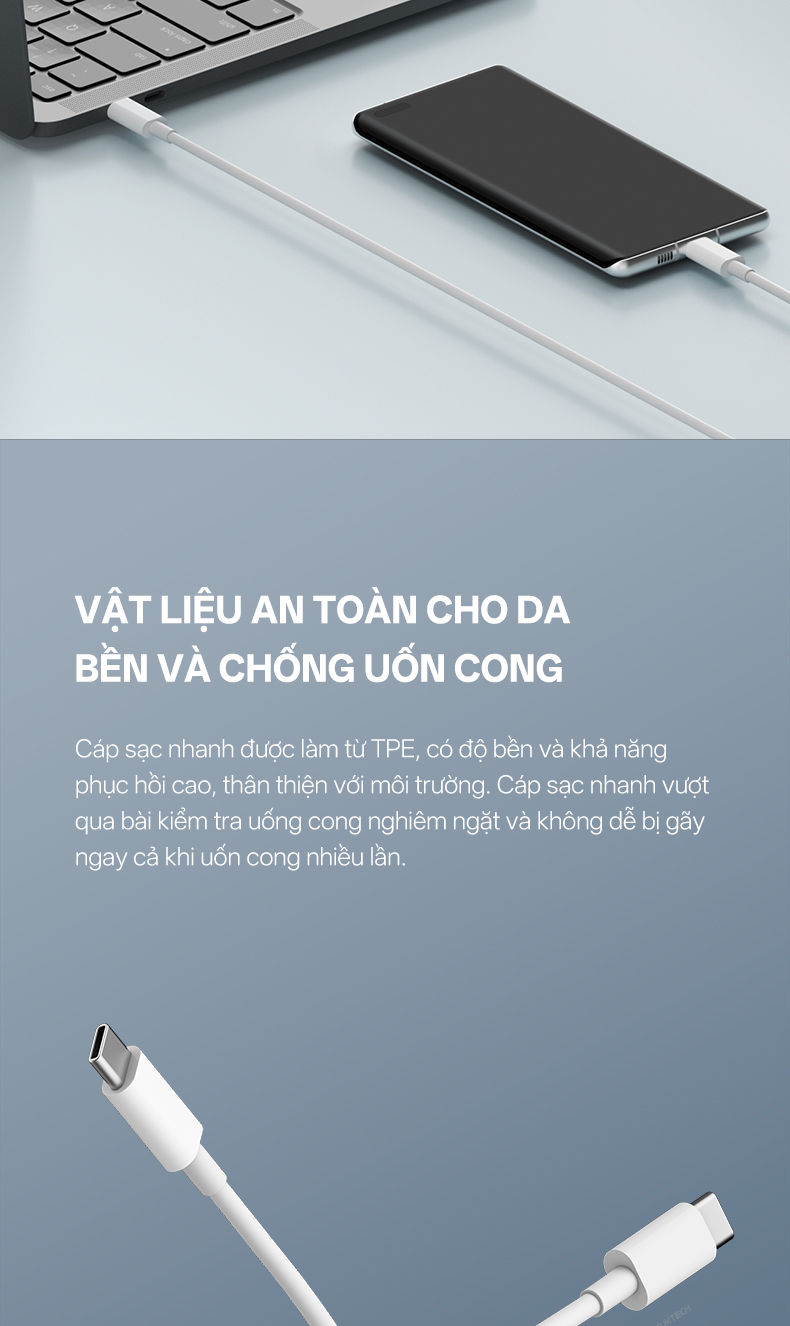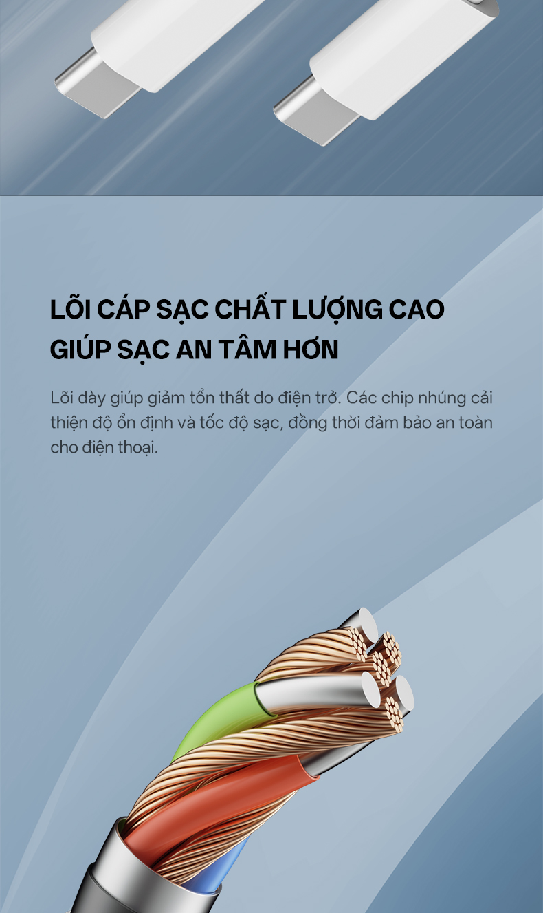 Một trong những điểm mạnh của cáp sạc nhanh CUKTECH KLC-5499 là độ bền ấn tượng. Vỏ ngoài làm từ nhựa TPE dẻo dai, vừa chống gãy gập vừa hạn chế tình trạng rối dây. Bên trong là lõi đồng tinh khiết dày, giúp truyền tải điện năng ổn định và giảm thất thoát. Đầu nối bằng nhựa PC cứng được gia cố chắc chắn, chịu được hàng nghìn lần cắm rút mà không hư hỏng. Thiết kế này giúp sản phẩm không chỉ bền bỉ khi sử dụng lâu dài, mà còn mang lại sự yên tâm cho người dùng khi mang theo trong túi xách, balo mà không lo hỏng hóc.