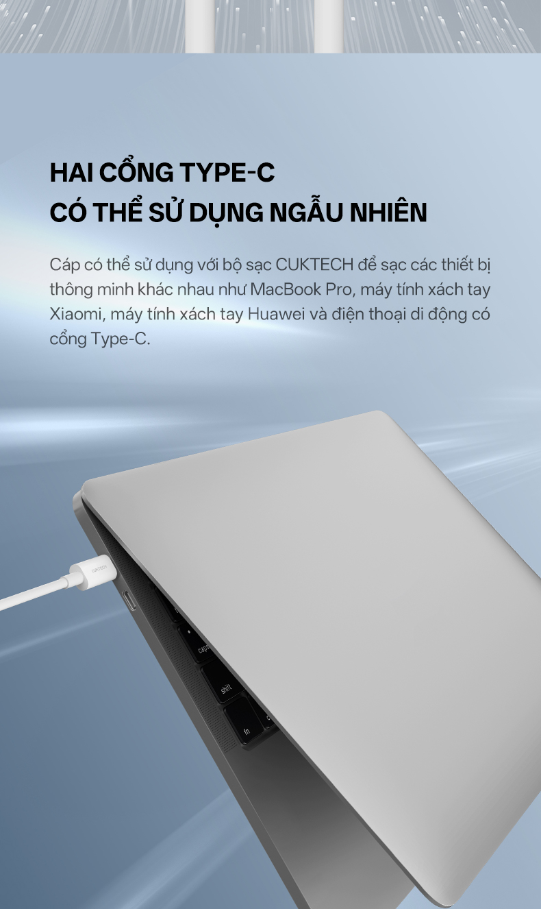 Cáp CUKTECH KLC-5499 có thể sử dụng cho hầu hết các thiết bị sử dụng cổng USB-C. Từ iPhone 15 Series, iPad Pro/Mini, các dòng smartphone Android, cho đến laptop USB-C như MacBook hay Ultrabook, tất cả đều tương thích hoàn hảo. Người dùng chỉ cần một sợi cáp duy nhất cho nhiều thiết bị, không còn phải mang theo nhiều loại dây khác nhau. Đặc biệt, khả năng sạc mạnh mẽ giúp cáp đáp ứng cả nhu cầu sạc nhanh cho laptop, điều mà nhiều loại cáp phổ thông không thể làm được.