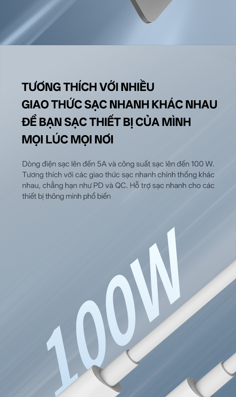 Cáp CUKTECH KLC-5499 hỗ trợ sạc nhanh công suất 100W (20V/5A), giúp bạn rút ngắn đáng kể thời gian nạp pin cho thiết bị. Nếu với cáp thường, việc sạc một chiếc laptop có thể mất hàng giờ, thì với chuẩn PD và QC 3.0, cáp KLC-5499 cho phép cung cấp dòng điện ổn định và mạnh mẽ, giúp MacBook Pro, iPad Pro hay smartphone Android sạc đầy nhanh hơn mà không gây nóng máy. Đặc biệt, sản phẩm được tích hợp chip thông minh kiểm soát dòng điện, giúp bảo vệ pin thiết bị, chống quá tải và quá nhiệt. Đây chính là sự cân bằng hoàn hảo giữa tốc độ và độ an toàn, phù hợp với người dùng bận rộn, cần một giải pháp sạc hiệu quả, tiết kiệm thời gian.