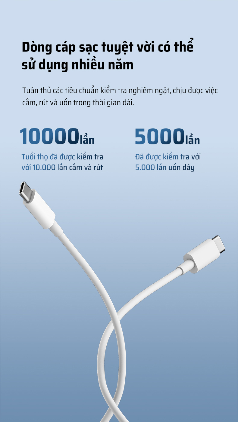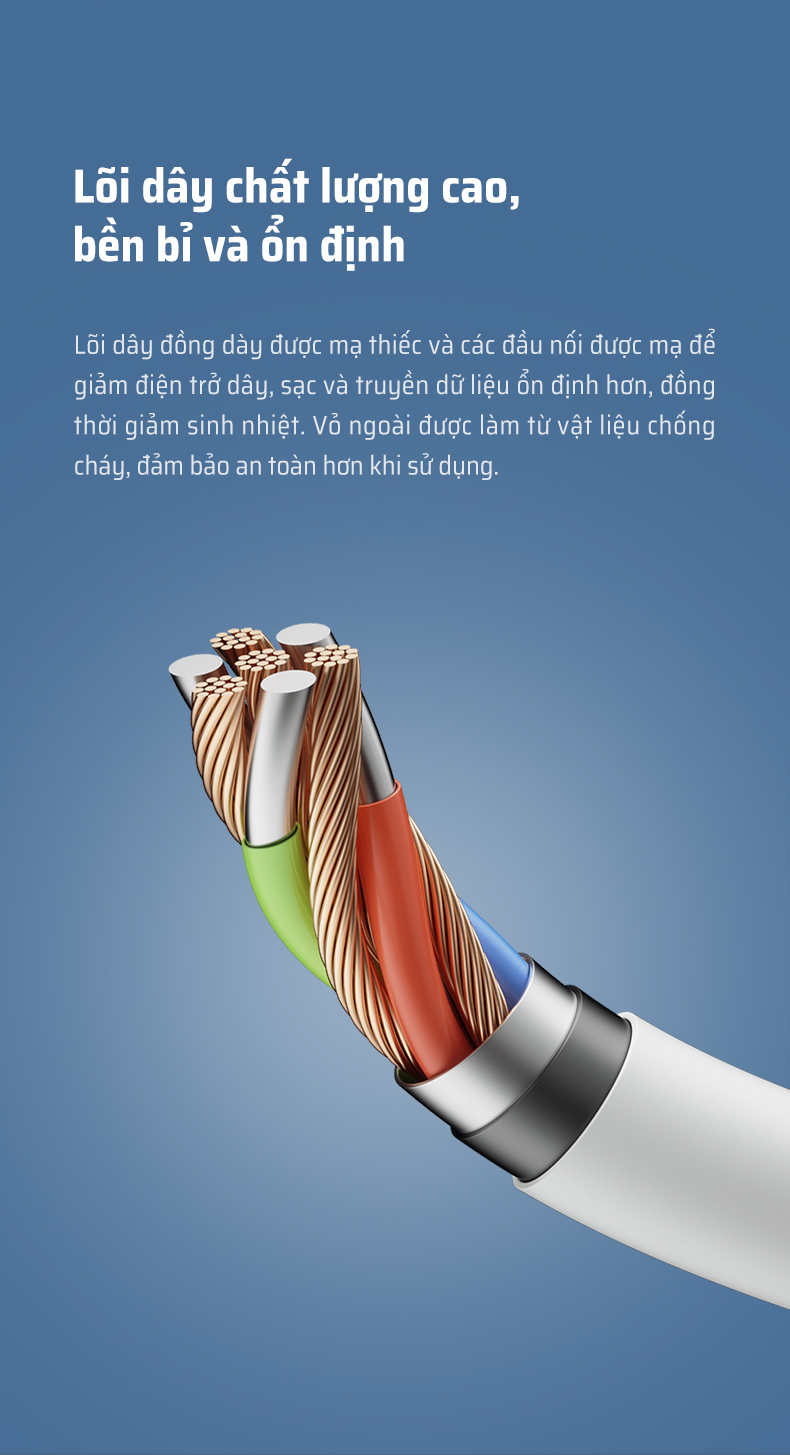Cáp được sản xuất với lõi đồng mạ thiếc cao cấp giúp dẫn điện tốt, giảm hao hụt năng lượng và duy trì khả năng sạc ổn định. Lớp vỏ ngoài bằng TPE chống cháy, mềm dẻo, có khả năng chống gãy gập khi sử dụng lâu dài. Sản phẩm đã trải qua hơn 5.000 lần thử nghiệm uốn cong và 10.000 lần cắm/rút, chứng minh độ bền vượt trội.