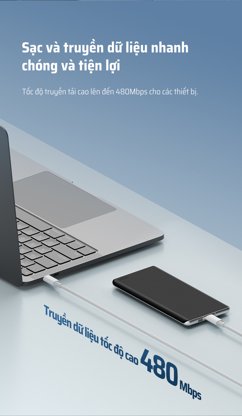 Không chỉ nổi bật ở khả năng sạc, cáp sạc nhanh type C CUKTECH CTC310N còn hỗ trợ tốc độ truyền dữ liệu lên đến 480Mbps. Với tốc độ này, việc sao chép một tệp tin dung lượng 1GB chỉ mất khoảng 25 giây. Người dùng có thể dễ dàng chuyển ảnh, video hay tài liệu công việc từ điện thoại sang laptop mà không lo bị gián đoạn.