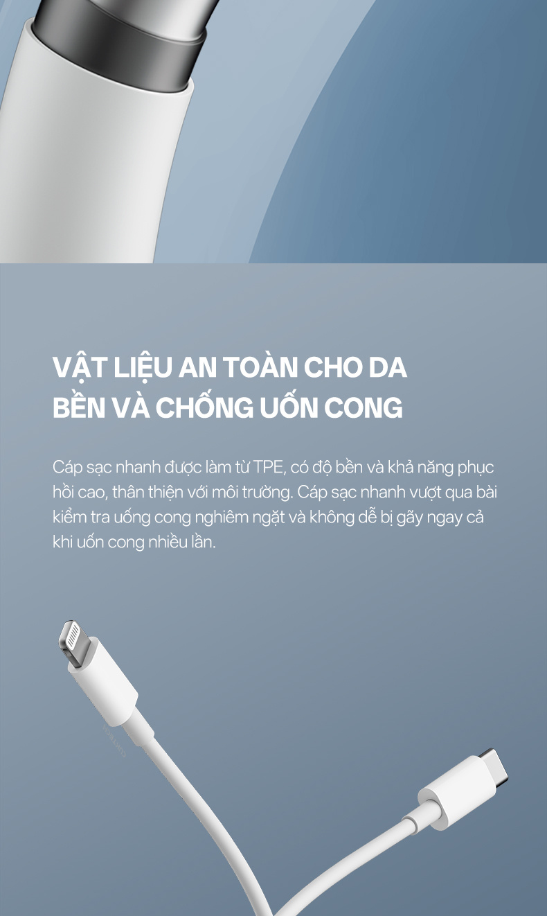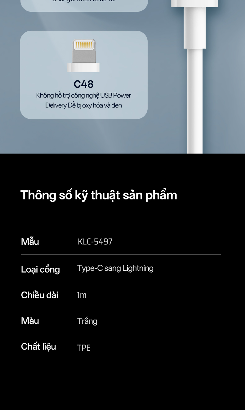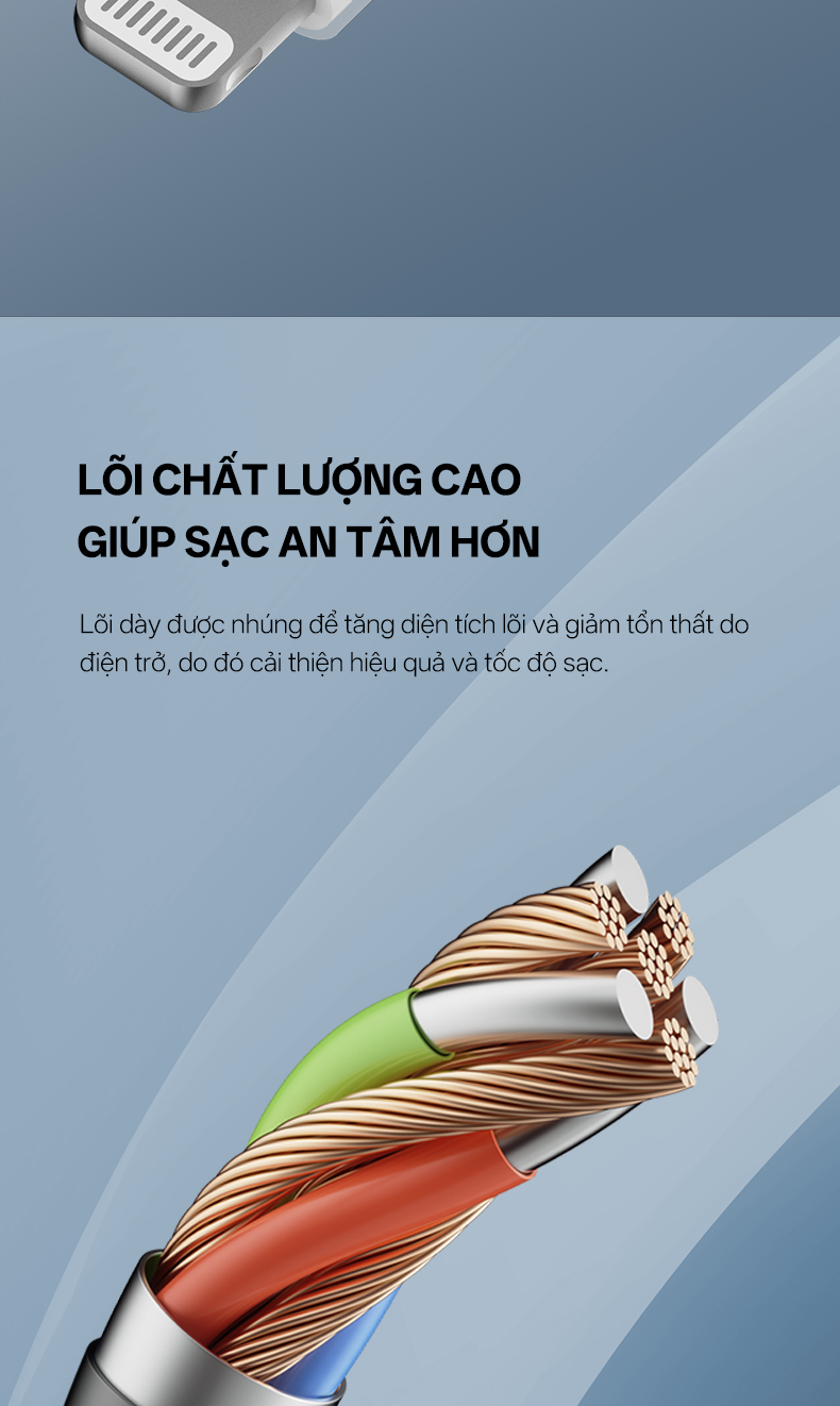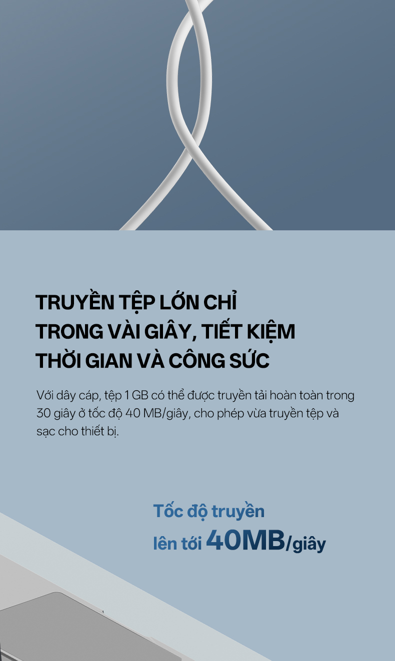 Vỏ cáp được làm từ TPE cao cấp, có độ đàn hồi vượt trội, kết hợp với lõi đồng tinh khiết, giúp cáp bền bỉ, chống gãy gập, đồng thời giảm điện trở, truyền tải điện năng và dữ liệu ổn định. Với tốc độ truyền dữ liệu lên đến 480Mbps, người dùng có thể đồng bộ dữ liệu, chuyển hình ảnh, video hay nhạc từ iPhone sang máy tính một cách nhanh chóng mà không lo gián đoạn. Đầu nối C94 chuẩn Apple còn giúp chống oxy hóa, không gỉ sét, đảm bảo độ bền lâu dài. Sản phẩm mang lại sự yên tâm và trải nghiệm mượt mà khi sử dụng hàng ngày, dù tại nhà, văn phòng hay trên ô tô.