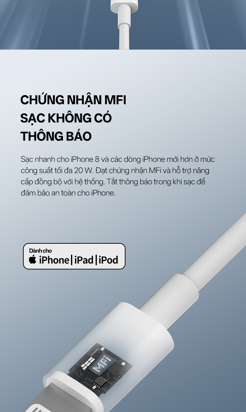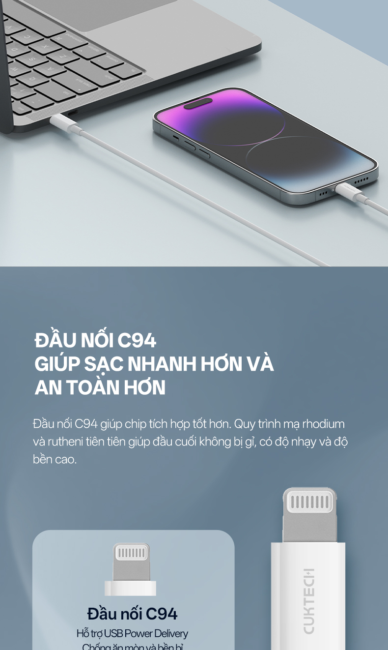 Cáp CUKTECH KLC-5497 đạt chuẩn MFi, được Apple chứng nhận, đảm bảo tương thích hoàn toàn với các thiết bị iPhone, iPad, iPod. Điều này có nghĩa là người dùng không còn phải lo lắng về việc cáp gây lỗi, sạc chậm hay thiết bị hiển thị cảnh báo không hỗ trợ phụ kiện. Chuẩn MFi cũng đảm bảo cáp được thiết kế để tối ưu dòng điện và bảo vệ pin, giúp tuổi thọ thiết bị được kéo dài. Người dùng có thể yên tâm sử dụng cáp để sạc nhanh hay đồng bộ dữ liệu mà không gặp tình trạng gián đoạn hay mất dữ liệu. Với tính năng này, cáp hoàn toàn có thể thay thế phụ kiện chính hãng, mang lại sự tiện lợi và tiết kiệm chi phí mà vẫn đảm bảo hiệu suất và an toàn.