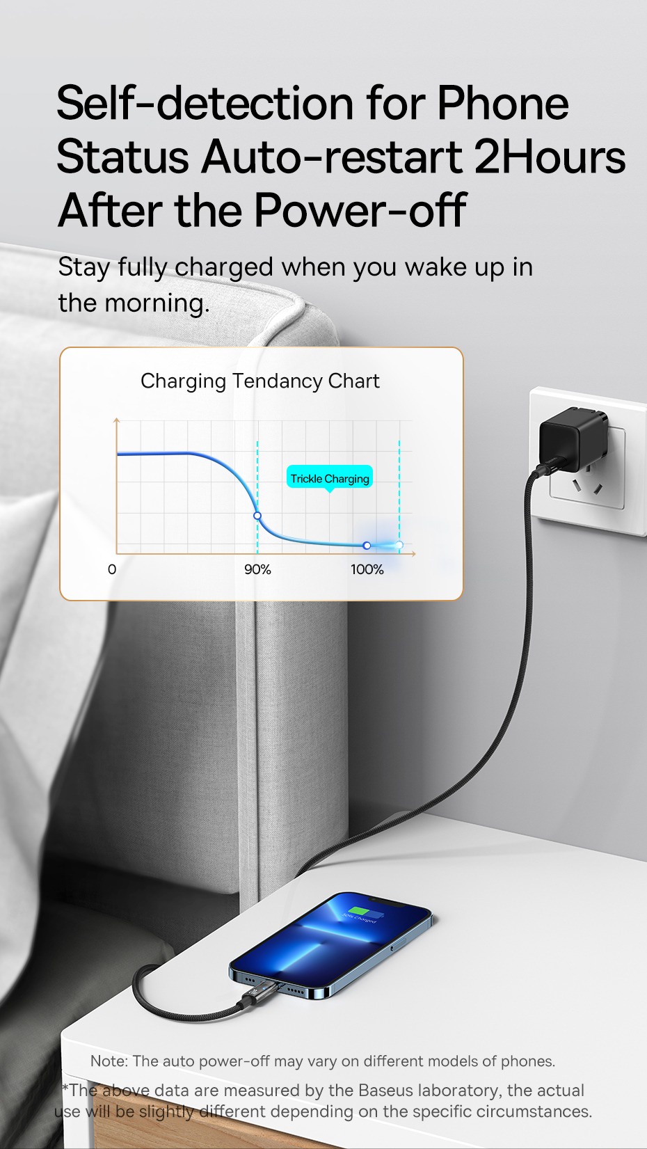 Self-Detection : Sau khoảng 2 giờ kể từ khi ngắt hoàn toàn dòng sạc , Cáp sạc Baseus Explorer Series sẽ tự động kết nối sạc lại .