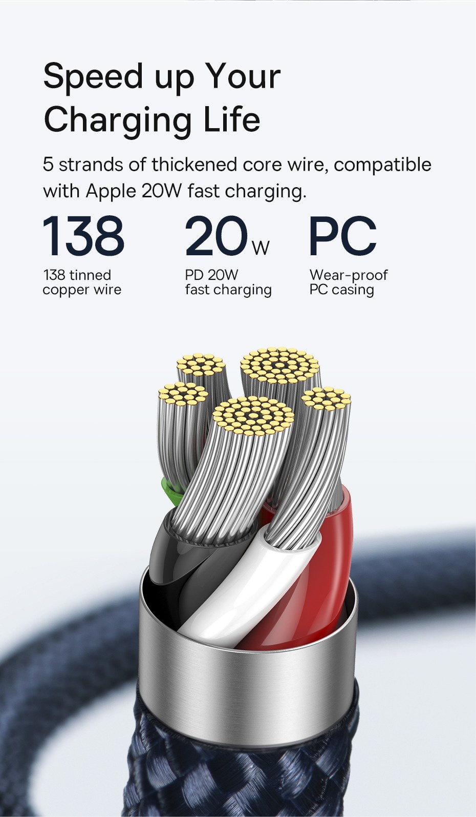 - Đầu cáp với chất liệu hợp kim cao cấp siêu bền , đầu cáp và các tiếp điểm được thiết kế lại để đảm bảo bền hơn, chống gảy tốt, tiếp xúc tốt hơn và tương thích tốt hơn với IP . Dây cáp được bọc vải dù siêu bền cho tuổi thọ sử dụng lâu hơn.
