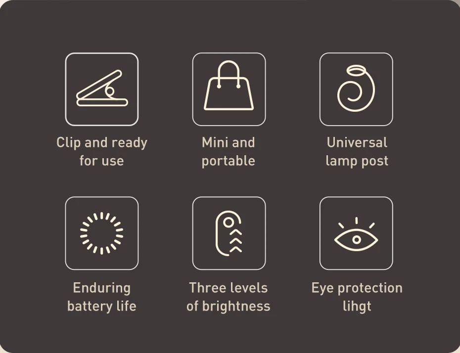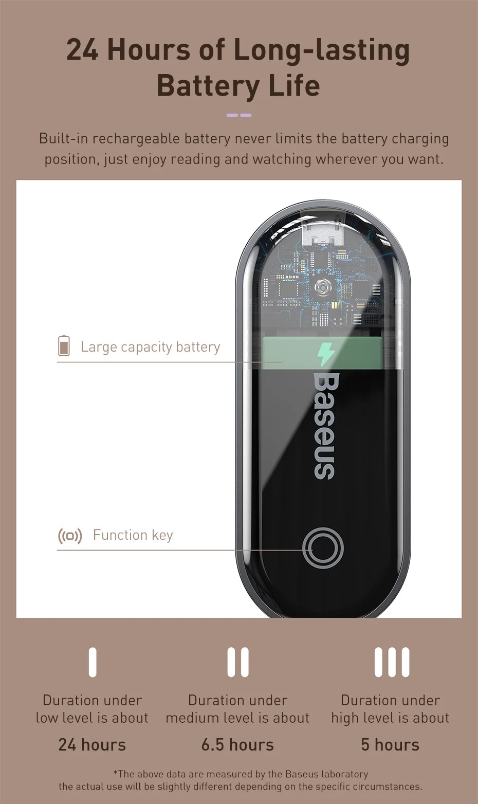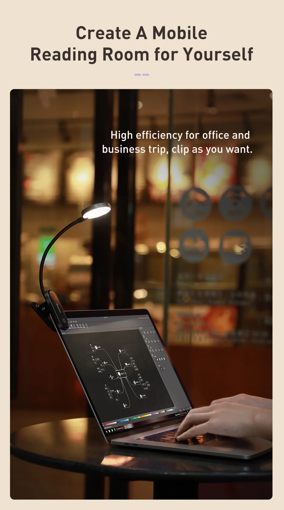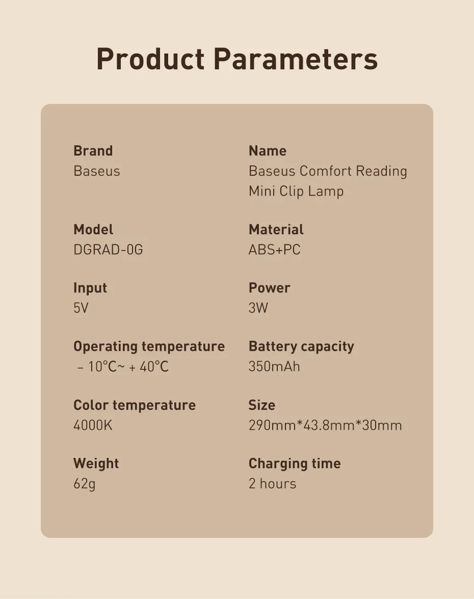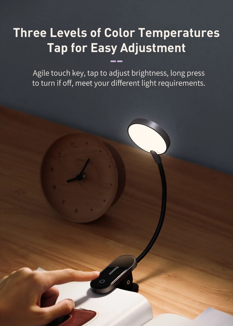- Như cái tên của nó, Baseus Comfort Reading Mini Clip Lamp là một đèn chuyên dụng dùng cho đọc sách buổi tối. Sản phẩm được thiết kế dạng kẹp với kích thước vô cùng nhỏ gọn có thể mang theo sử dụng mọi nơi . Độ sáng vừa phải, tần số quét cao, chống rung, chống chói và gây mõi mắt .