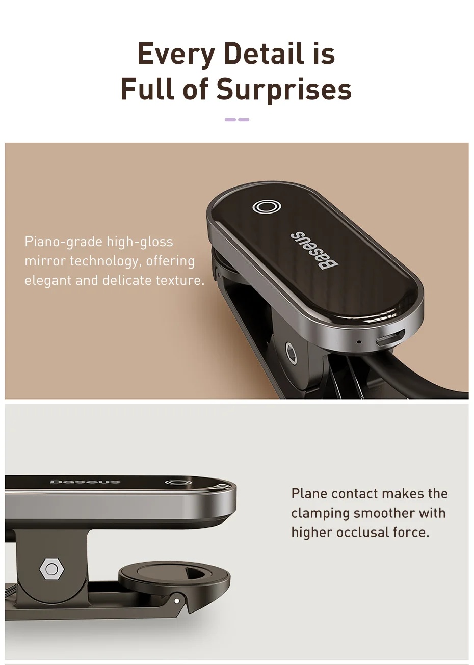 - Phần đáy là đầu kẹp với phần mặt có logo Baseus và phần cảm ứng với hình tròn màu trắng để bật/tắt cũng như tăng/giảm độ sáng.