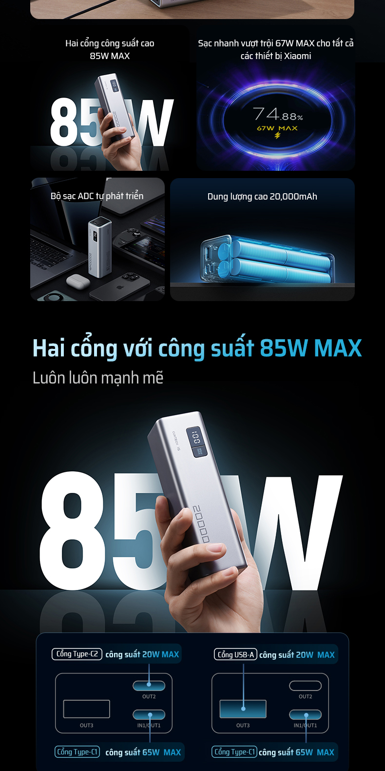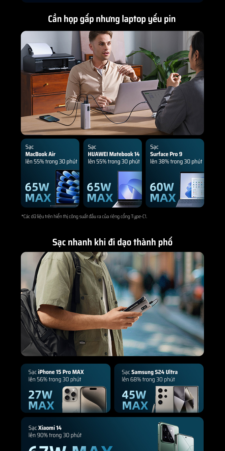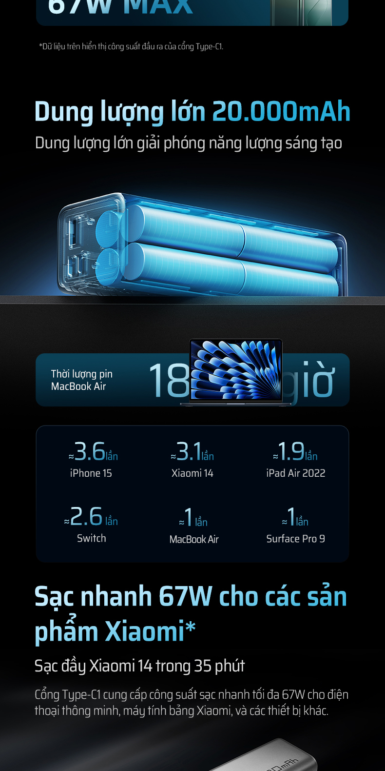 | Tính năng sạc nhanh | – Laptop: Lên đến 65W Max – Xiaomi: 67W Max – Huawei: 22.5W Max – Sạc 3 thiết bị cùng lúc – Tự sạc nhanh PD 65W (1h40p đầy) |