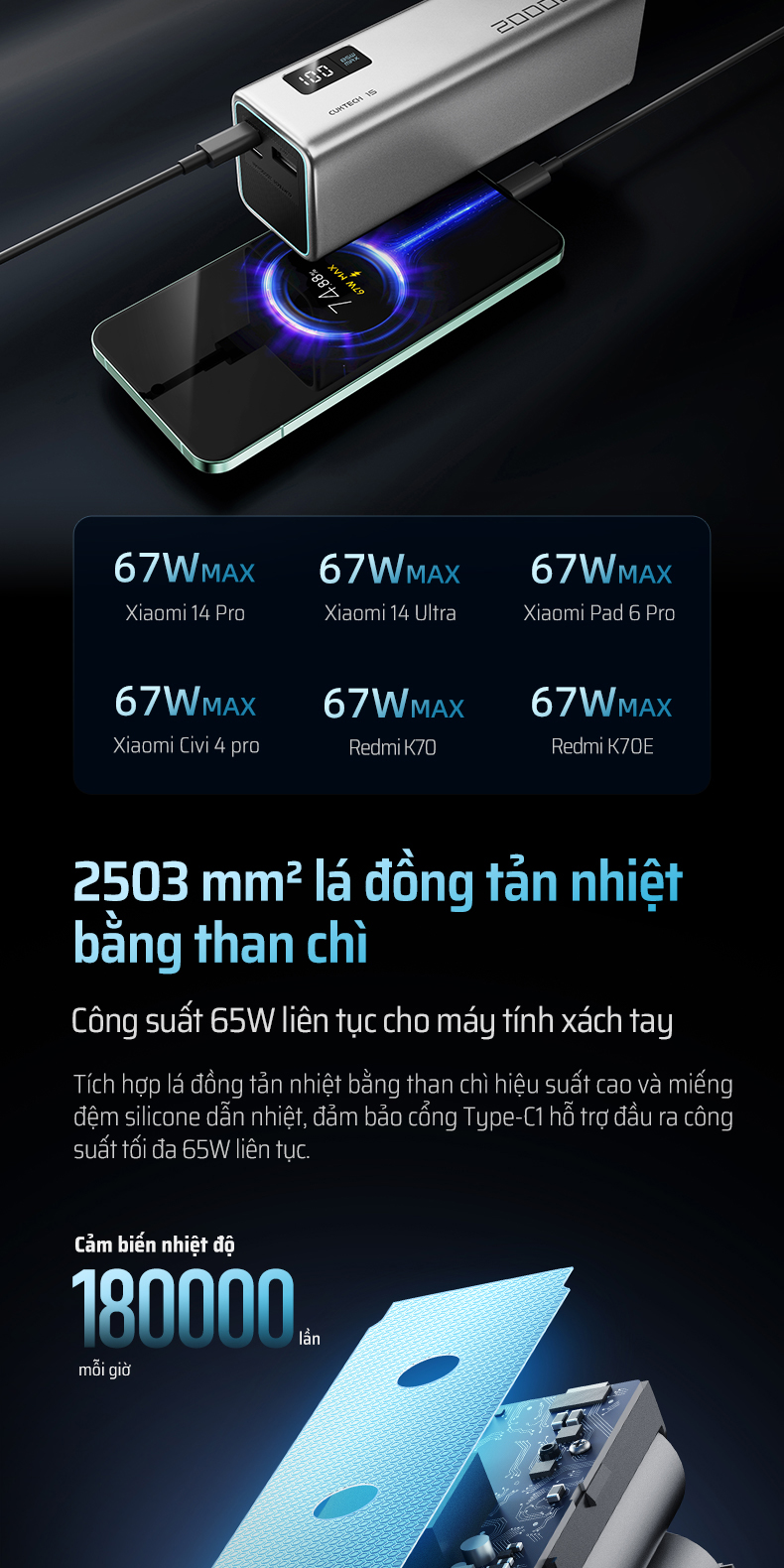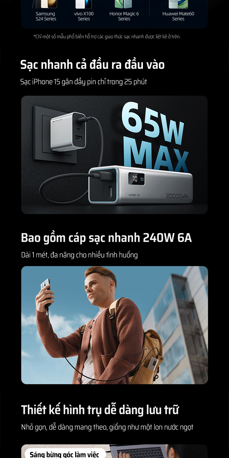 CUKTECH PB200 không chỉ mạnh mẽ với laptop mà còn tương thích tối ưu với nhiều thương hiệu điện thoại hàng đầu. Sản phẩm hỗ trợ sạc nhanh 67W cho điện thoại Xiaomi, 22.5W cho các dòng máy Huawei và sạc nhanh chuẩn QC, PD cho iPhone, Samsung và nhiều thiết bị Android khác.