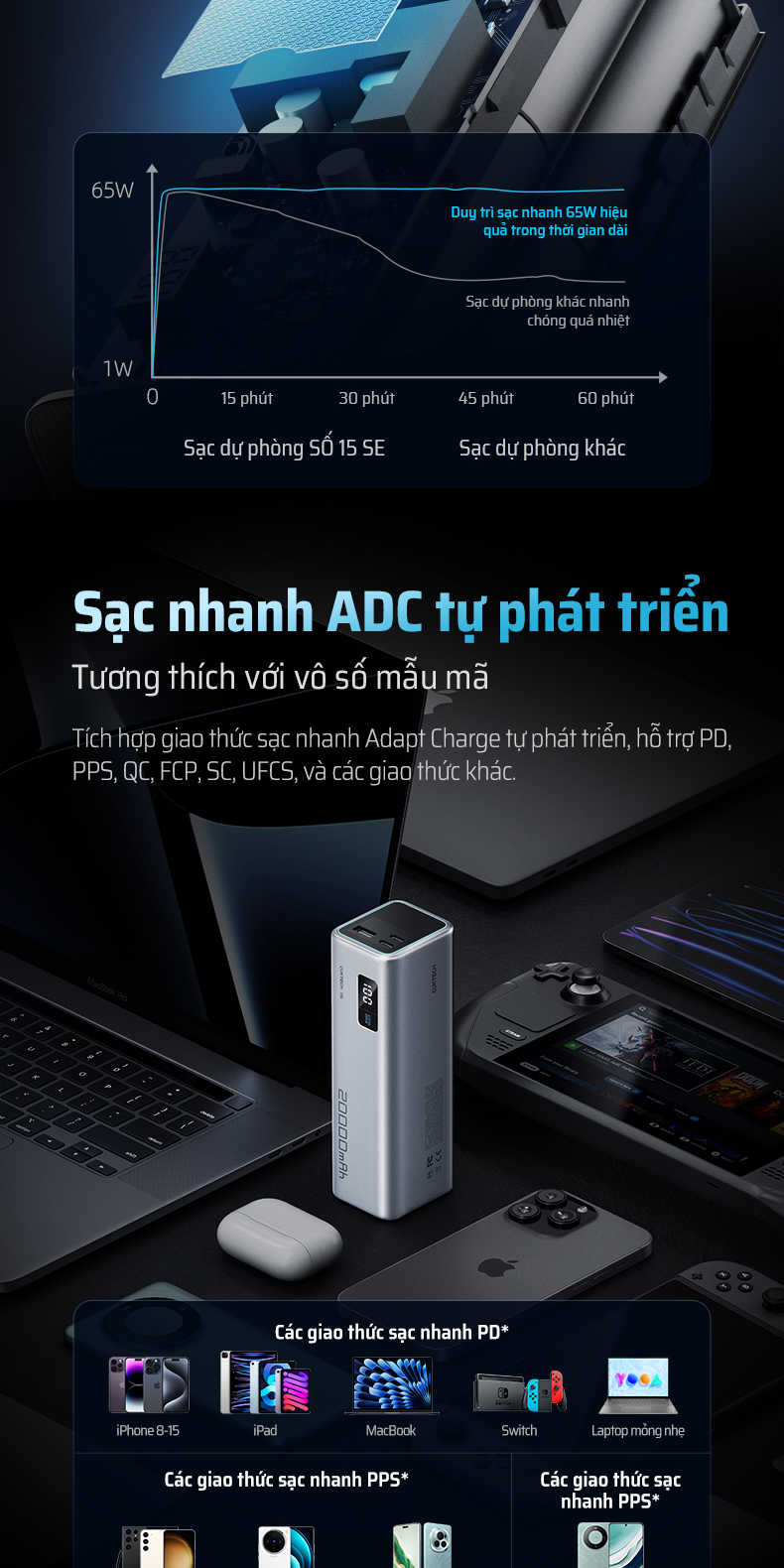 | Tương thích | Hỗ trợ PD, PPS, QC, FCP, SCP – tương thích hơn 1000 thiết bị (điện thoại, tablet, laptop…) |