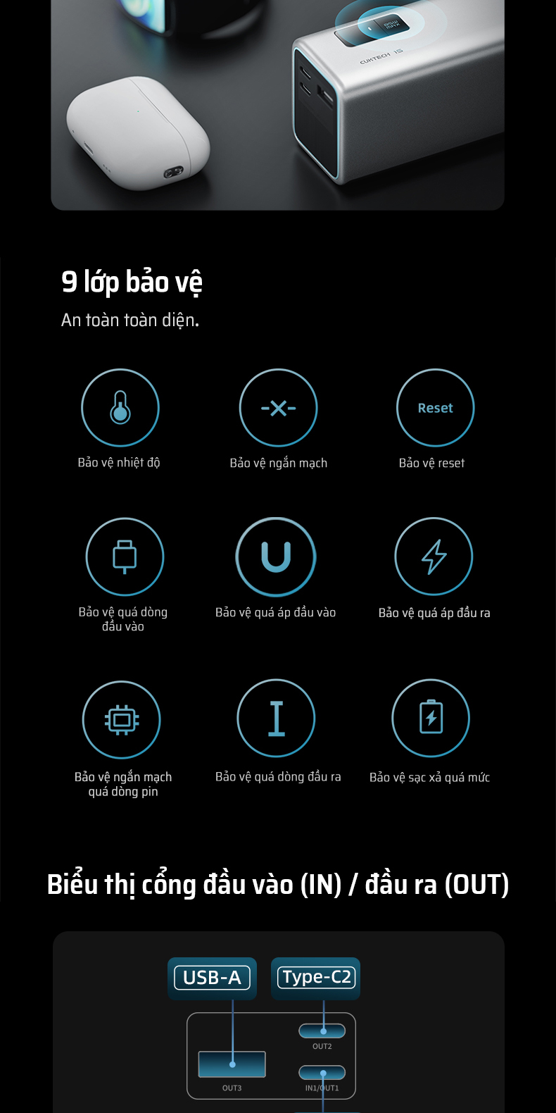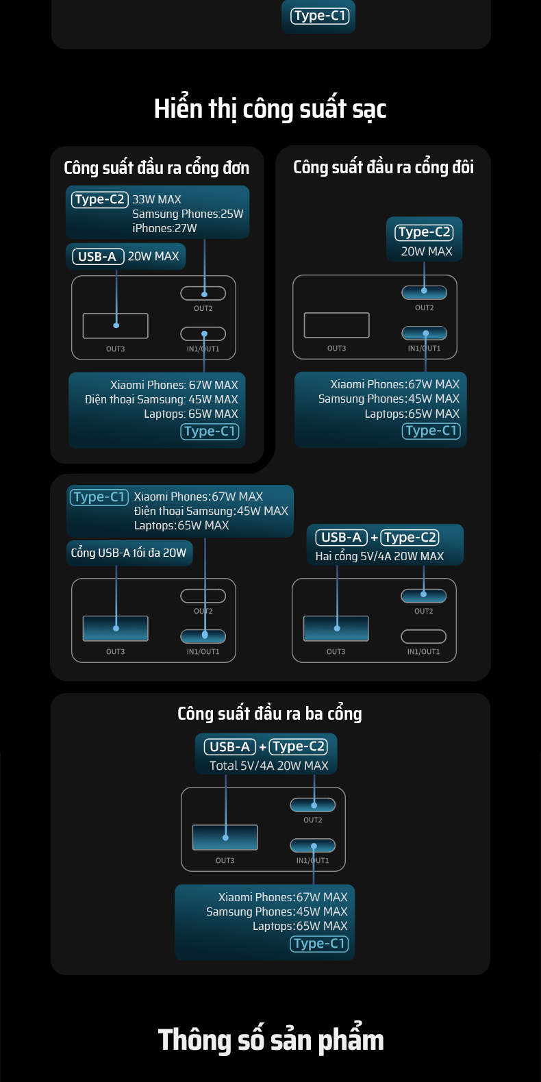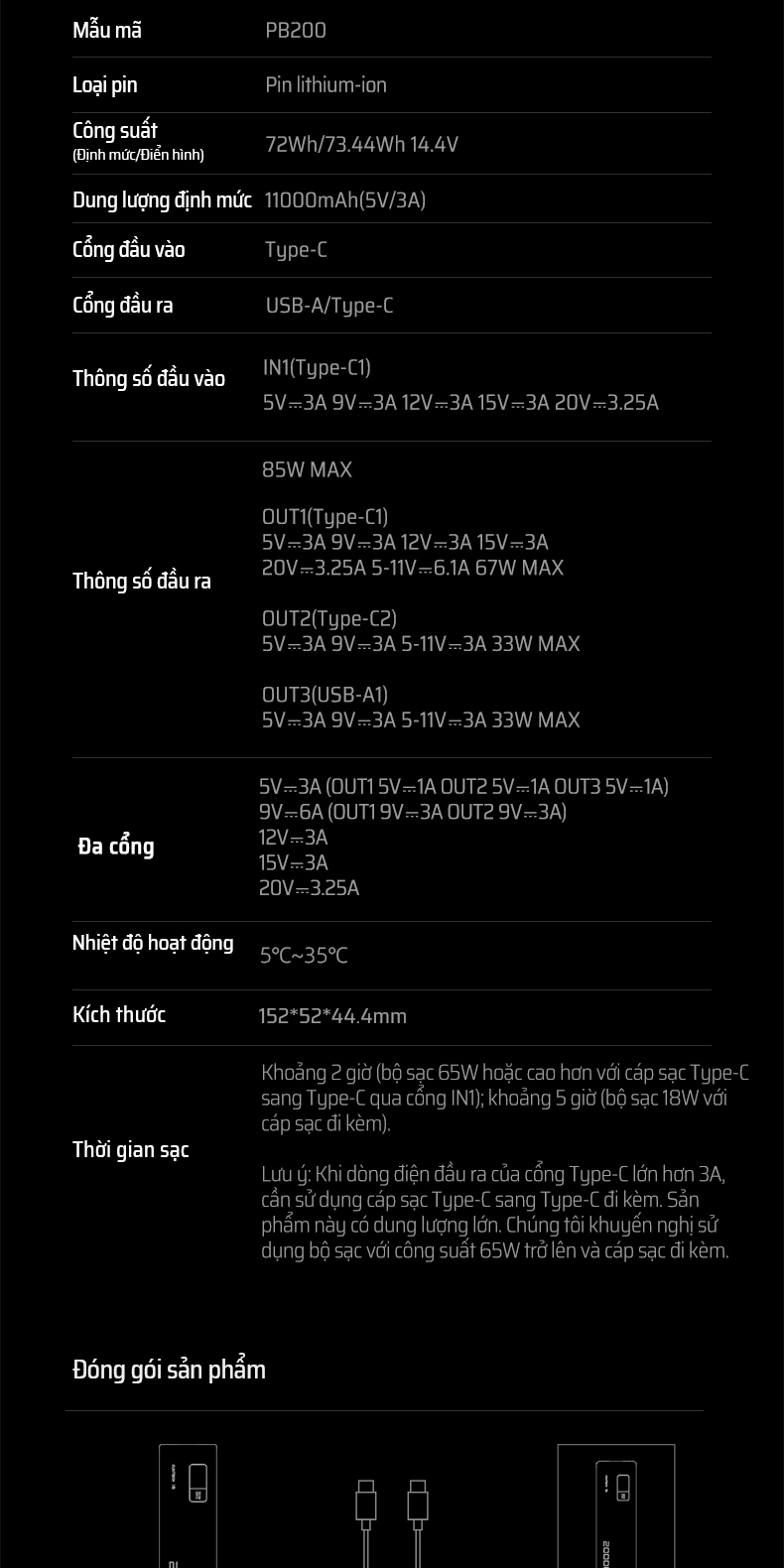 | Cổng ra (Output) | Type-C1 (OUT1): 5V=3A, 9V=3A, 12V=3A, 15V=3A, 20V=3.25A, 5-11V=6.1A (67W MAX) Type-C2 (OUT2): 5V=3A, 9V=3A, 5-11V=3A (33W MAX) USB-A1 (OUT3): 5V=3A, 9V=3A, 5-11V=3A (33W MAX) |