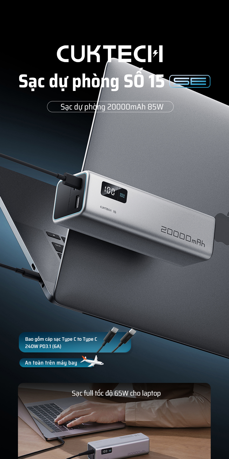 Sạc Dự Phòng CUKTECH PB200 20000mAh 85W là giải pháp năng lượng di động toàn diện, đáp ứng cả nhu cầu công việc lẫn giải trí. Từ khả năng sạc nhanh cho laptop, điện thoại đến sự tiện lợi trong việc hỗ trợ nhiều thiết bị cùng lúc, sản phẩm này chính là lựa chọn tối ưu cho những ai muốn sở hữu một pin sạc chất lượng, bền bỉ và an toàn.