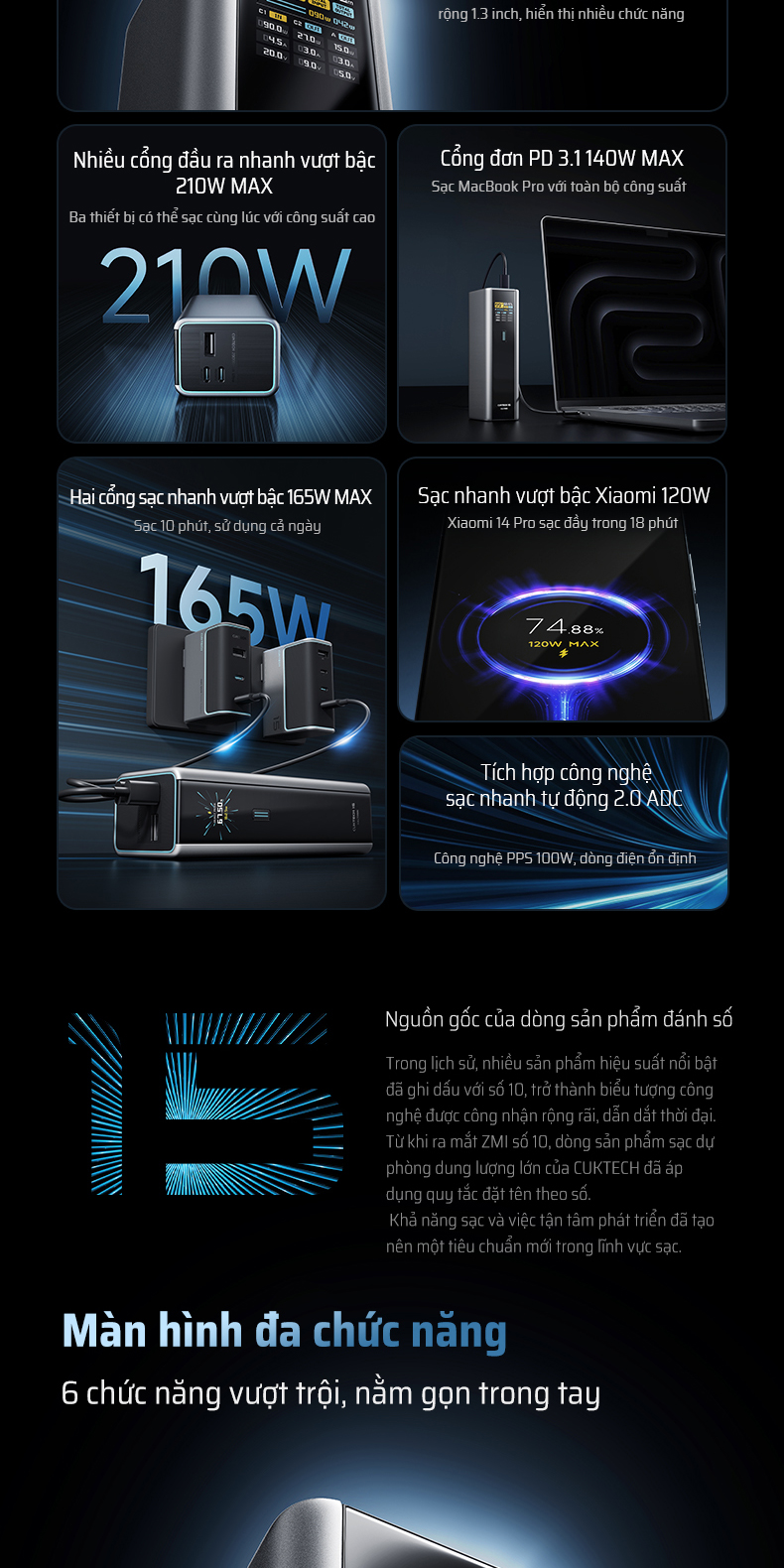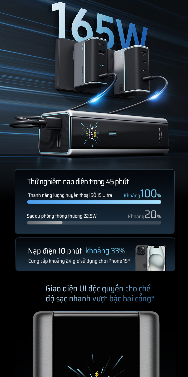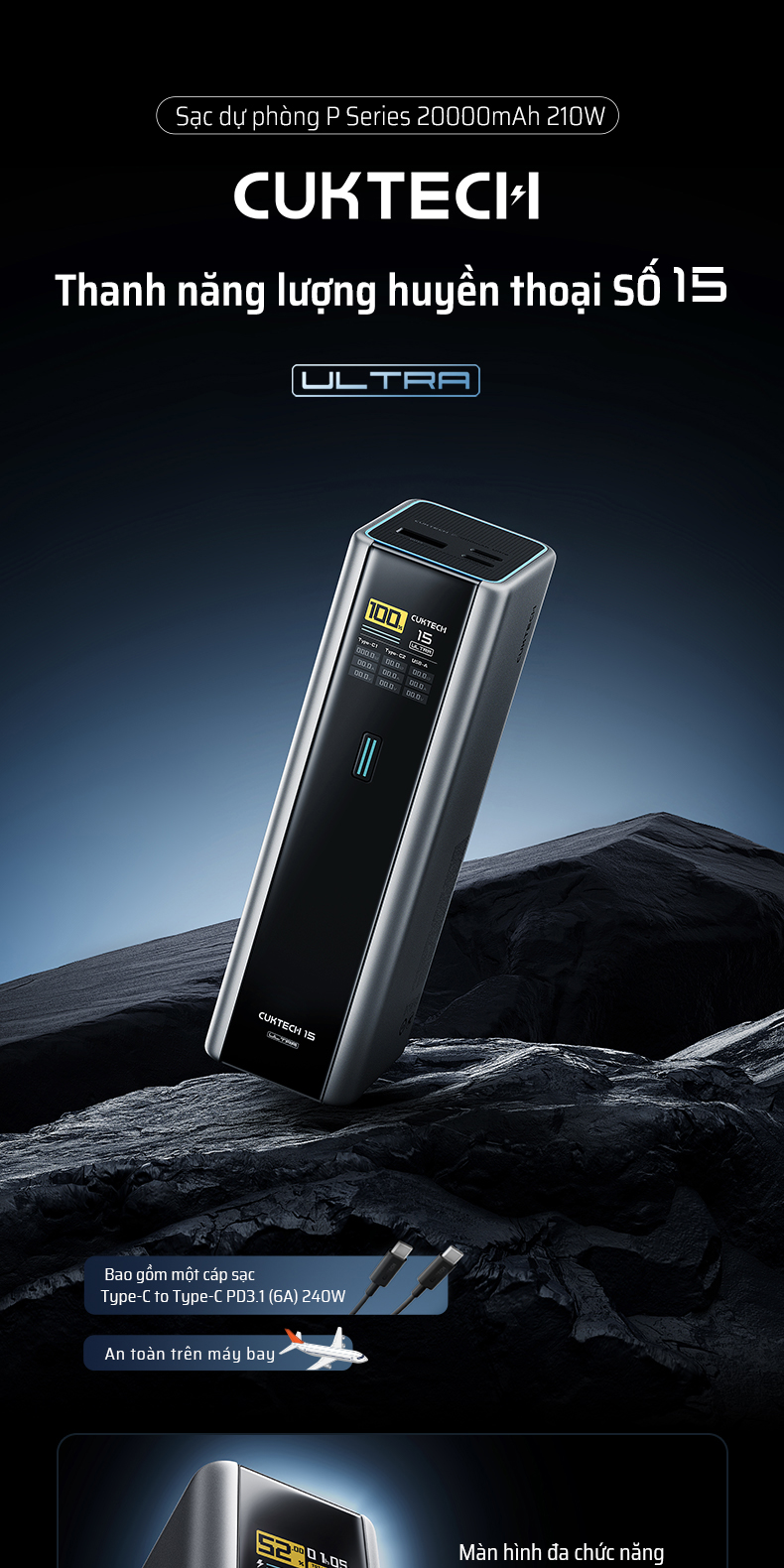 Sạc Dự Phòng Cuktech 15 Ultra 20000mAh 210W – Giải pháp sạc nhanh đỉnh cao với công suất 210W, hỗ trợ PD 3.1, PPS 2.0, Mi Turbo 120W, giúp bạn sạc MacBook, iPhone, iPad, Xiaomi, Samsung và nhiều thiết bị khác với tốc độ tối ưu. Dung lượng 20.000mAh, đủ năng lượng cho cả ngày dài.