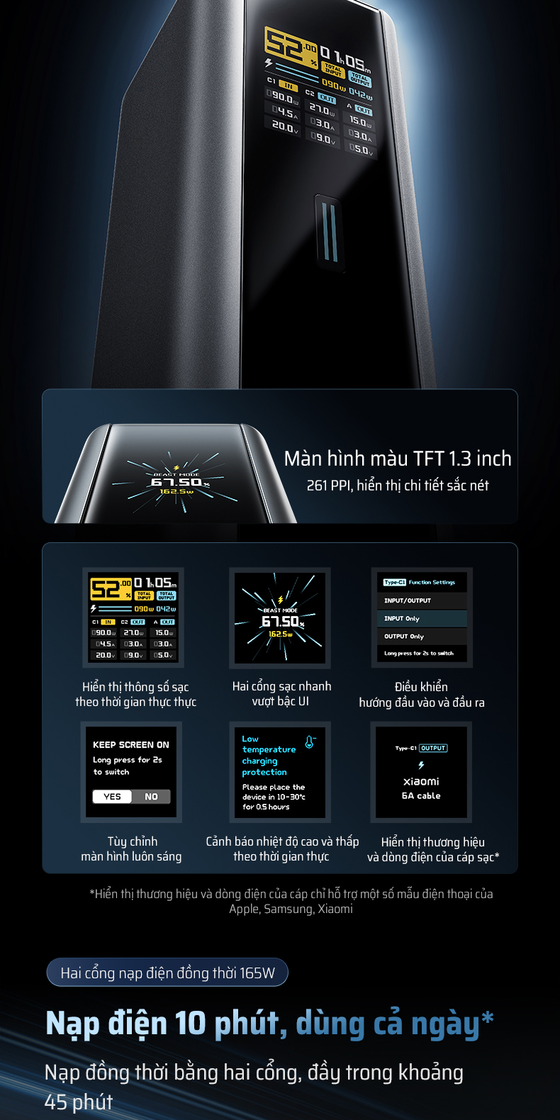 | Màn hình hiển thị | TFT màu 1.3 inch (hiển thị giao thức sạc, nhiệt độ, chiều dòng điện, trạng thái sạc) |