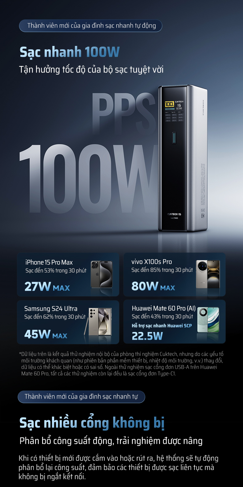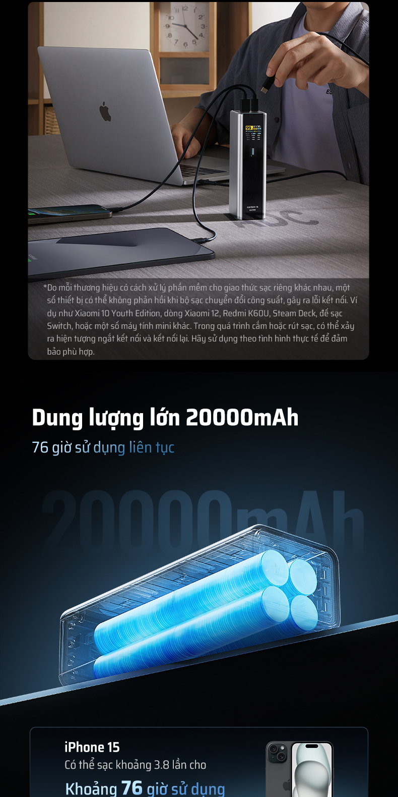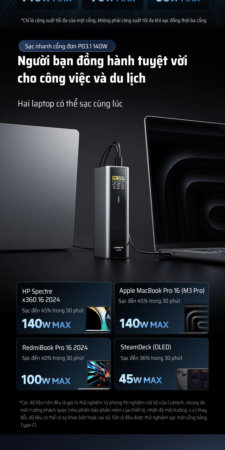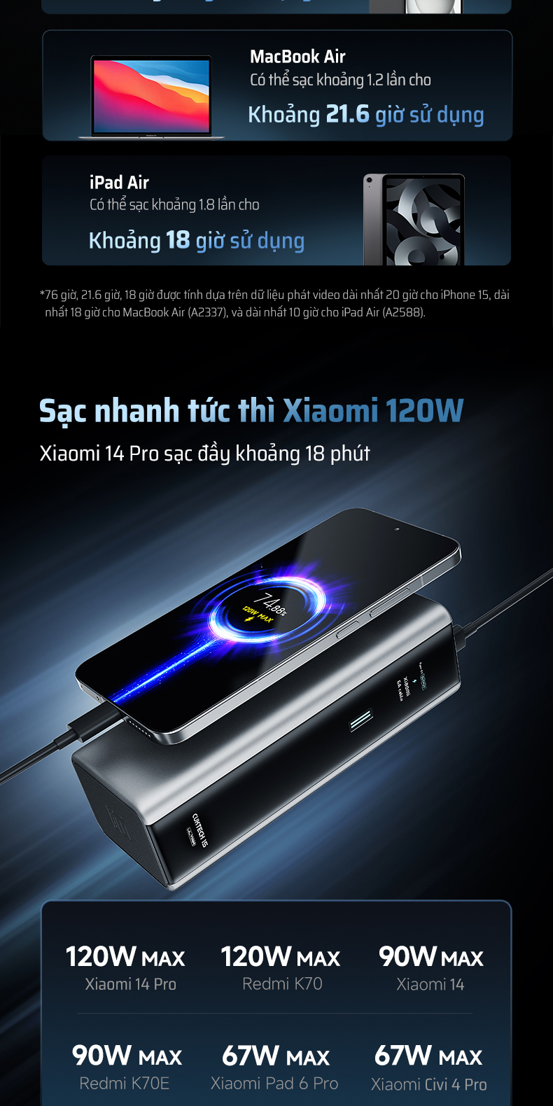 | Ghi chú | Công suất thực tế và thời gian sạc có thể thay đổi tùy theo thiết bị, cáp và điều kiện sử dụng. |