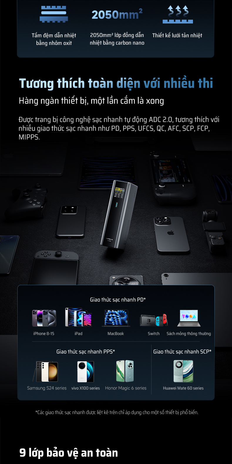 CUKTECH PB200U hỗ trợ chuẩn ADC 2.0 cùng nhiều giao thức sạc nhanh khác như PPS, QC, SCP, PD3.1, FCP và MiPPS (Xiaomi 120W Max). Điều này đảm bảo khả năng tương thích rộng rãi với nhiều thiết bị từ điện thoại Android, iPhone, tablet cho đến laptop. Với chỉ một viên pin dự phòng, bạn có thể yên tâm sạc cho hầu hết các thiết bị hiện đại mà không lo thiếu chuẩn kết nối. Đây là điểm nổi bật giúp CUKTECH PB200U trở thành giải pháp toàn diện cho cả công việc và giải trí.