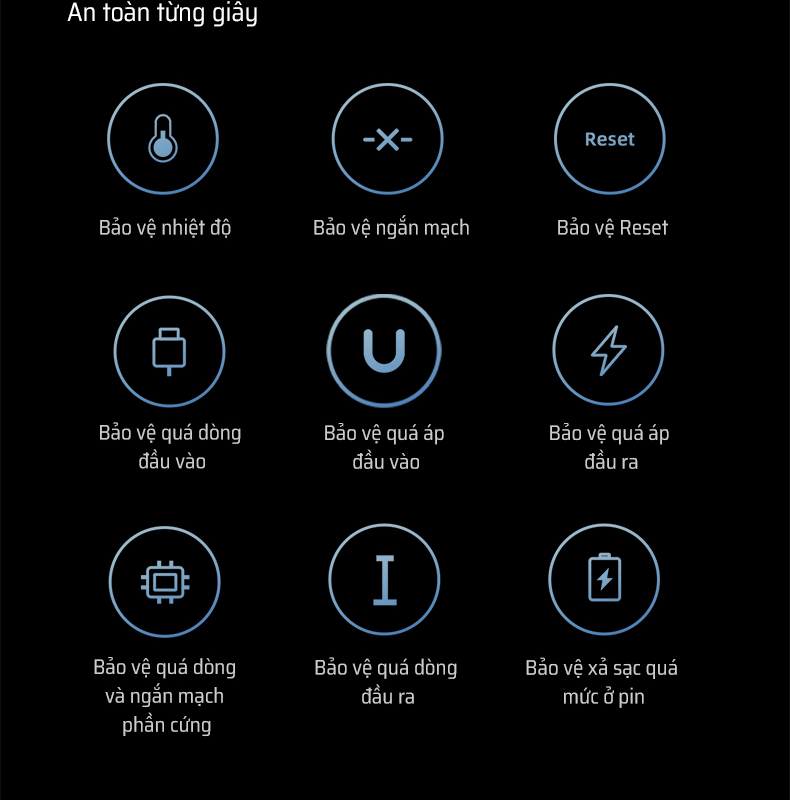 | Phân bổ công suất đa cổng (ví dụ) | • 5V/4A (OUT1: 5V/1.53A, OUT2: 5V/1.5A, OUT3: 5V/1A) • 9V/9A (OUT1: 9V/3A, OUT2: 9V/3A, OUT3: 9V/3A) • 12V/6A (OUT1: 12V/3A, OUT2: 12V/3A) • 15V/6A (OUT1: 15V/3A, OUT2: 15V/3A) • 20V/9A (OUT1: 20V/6A, OUT2: 20V/3A) |