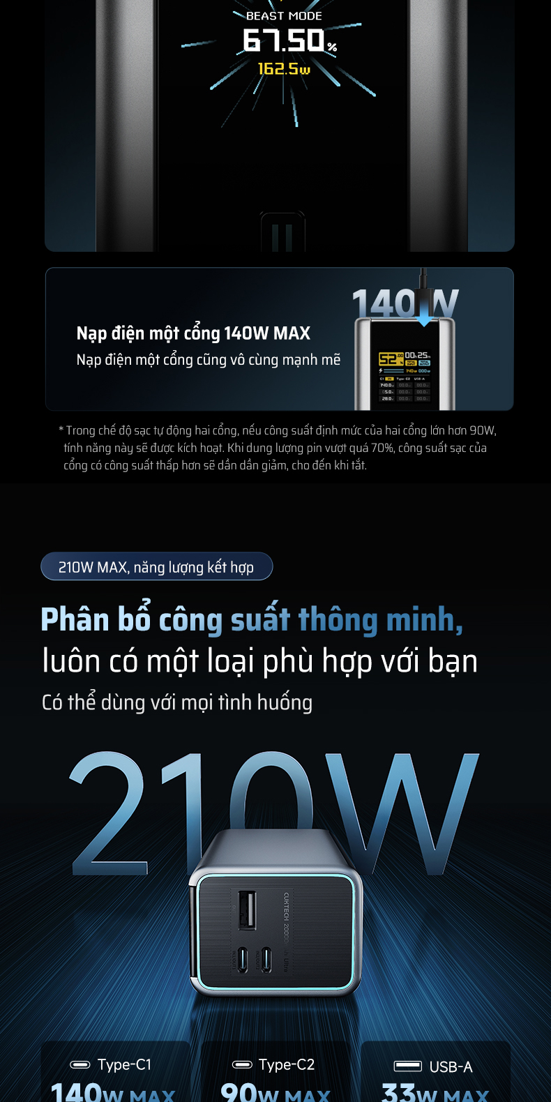 | Cổng ra (OUT) | OUT1 (Type-C1): 5V/3A, 9V/3A, 12V/3A, 15V/3A, 20V/5A, 5–20V/6A, 28V/5A — 140W Max OUT2 (Type-C2): 5V/3A, 9V/3A, 12V/3A, 15V/3A, 20V/3.25A, 5–11V/5A, 5–20V/4.5A — 90W Max OUT3 (USB-A1): 5V/3A, 9V/3A, 5–11V/3A — 33W Max Tổng công suất đầu ra: 210W Max (nhiều cổng đồng thời) |