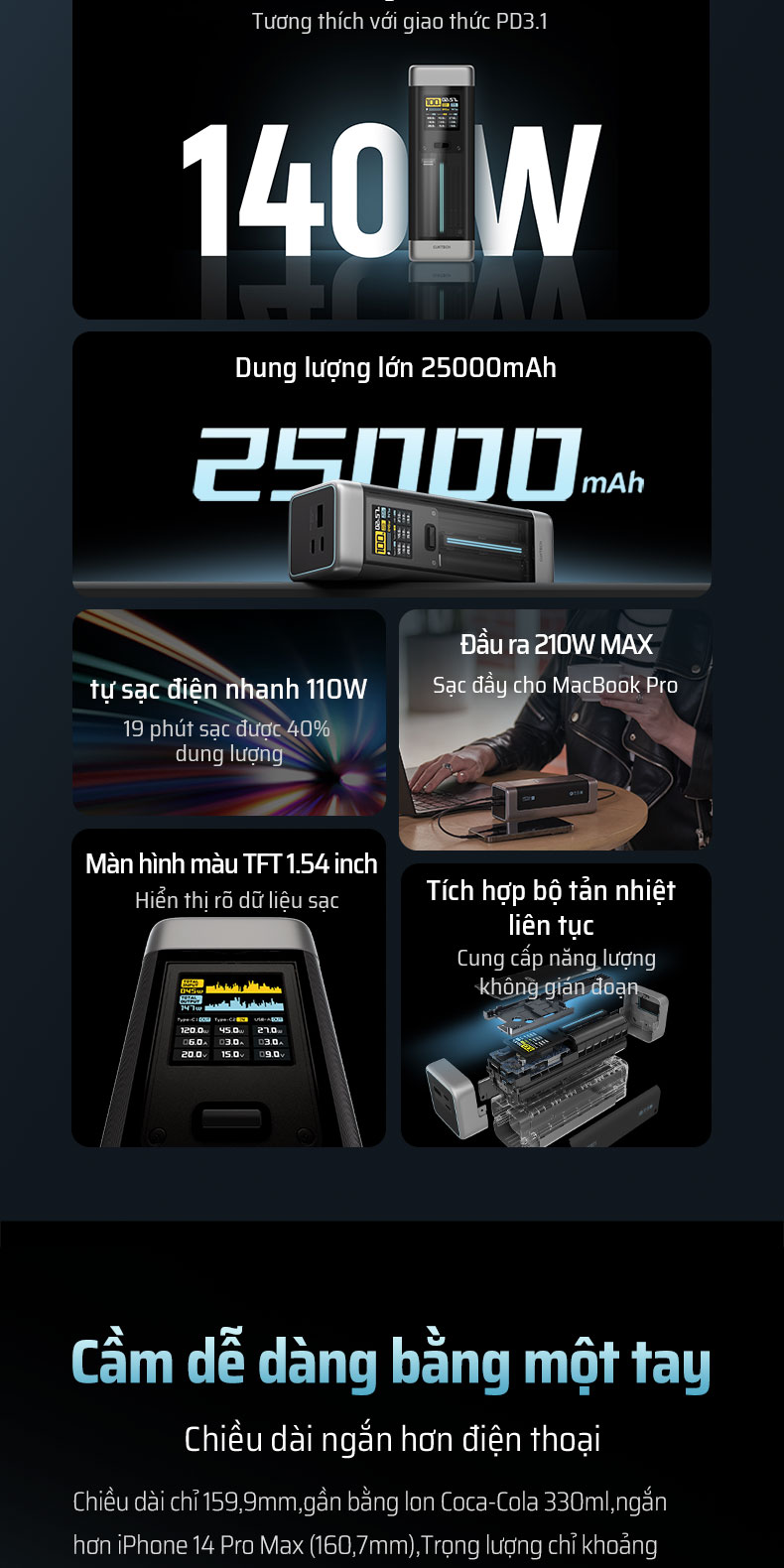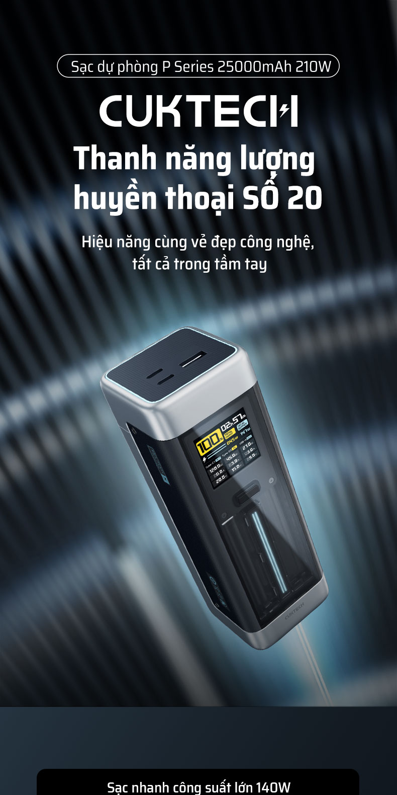CUKTECH P23 là Pin Sạc Dự Phòng 25000mAh 210W một trong những sản phẩm cao cấp được thiết kế dành riêng cho người dùng cần nguồn năng lượng lớn và ổn định. Với dung lượng 25.000mAh, công suất sạc tối đa 210W cùng khả năng hỗ trợ chuẩn sạc nhanh PD 3.1 hiện đại, sản phẩm không chỉ đáp ứng nhu cầu sạc điện thoại mà còn tối ưu cho các thiết bị yêu cầu công suất cao như laptop, đặc biệt là MacBook Pro.