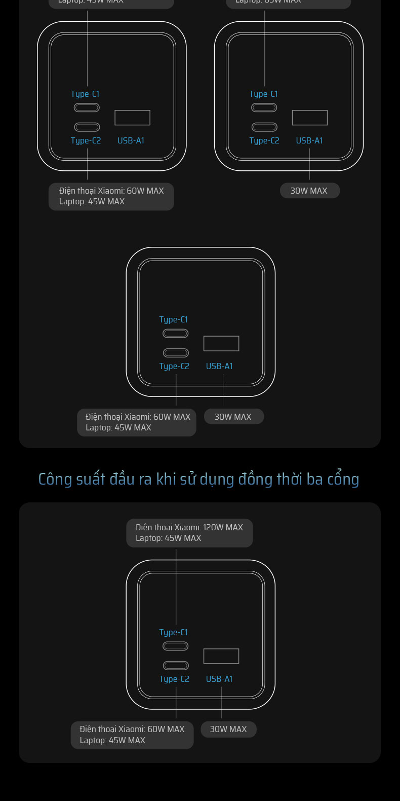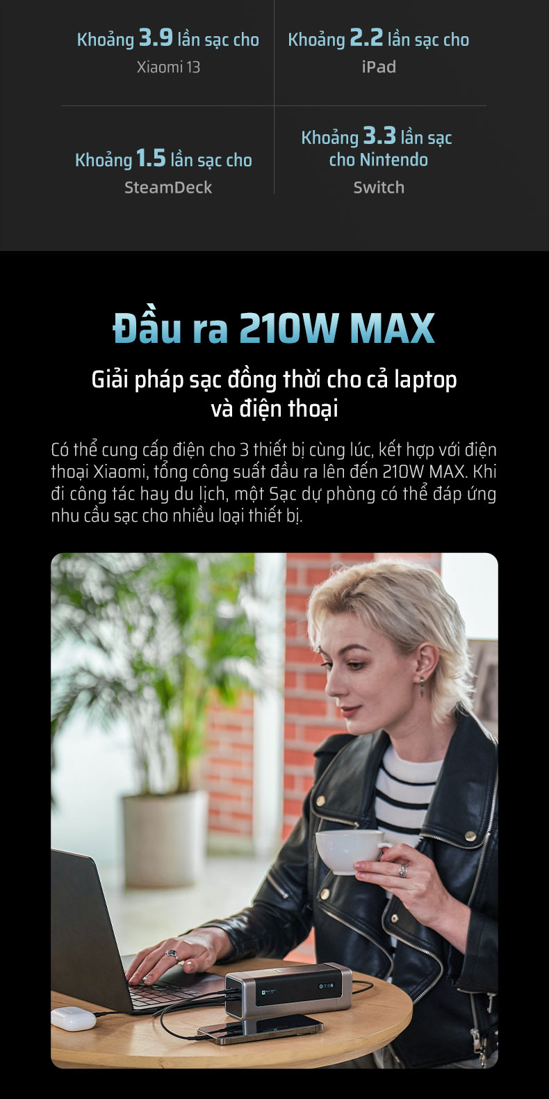 | Công suất tối đa | 210W (đa cổng) / 140W (một cổng Type-C) |