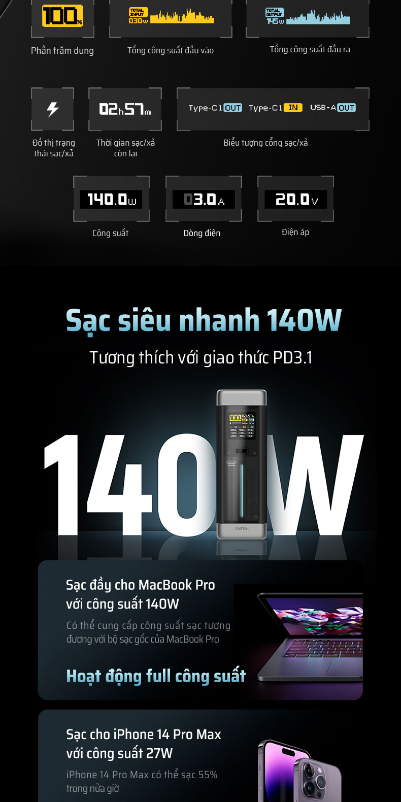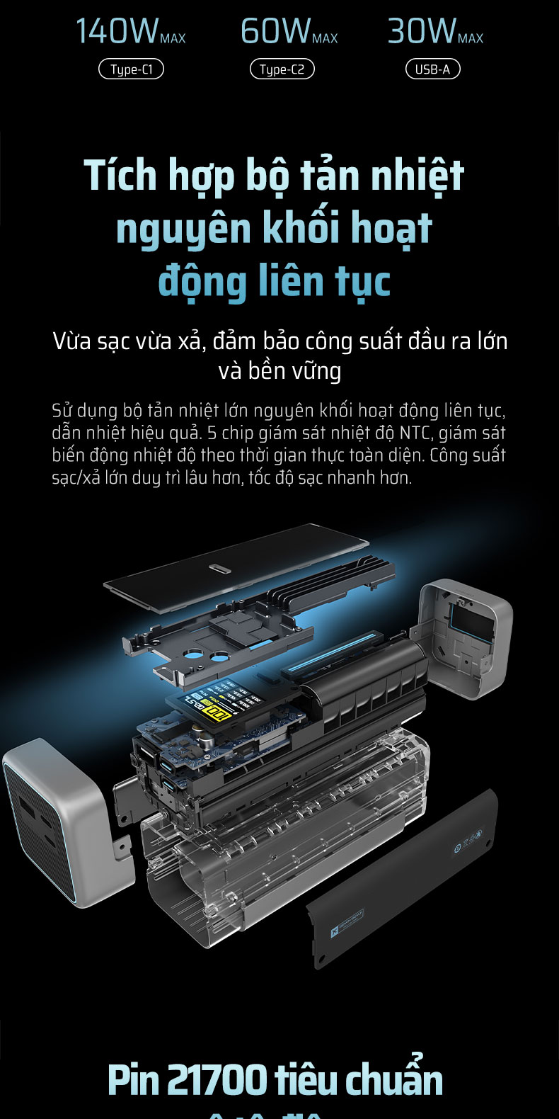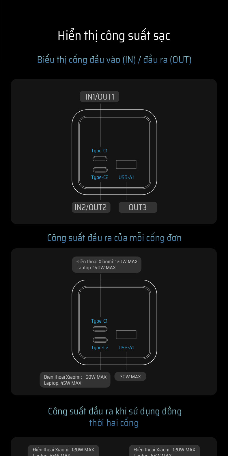 | Cổng ra (Output) | – Type-C1 (OUT1): 5V⎓3A, 9V⎓3A, 12V⎓3A, 15V⎓3A, 20V⎓5A, 28V⎓5A (140W Max) – Type-C2 (OUT2): 5V⎓3A, 9V⎓3A, 12V⎓3A, 15V⎓3A, 20V⎓3A (60W Max) – USB-A (OUT3): 5V⎓3A, 9V⎓2.23A, 12V⎓1.67A, 5~11V⎓3A (30W Max) |