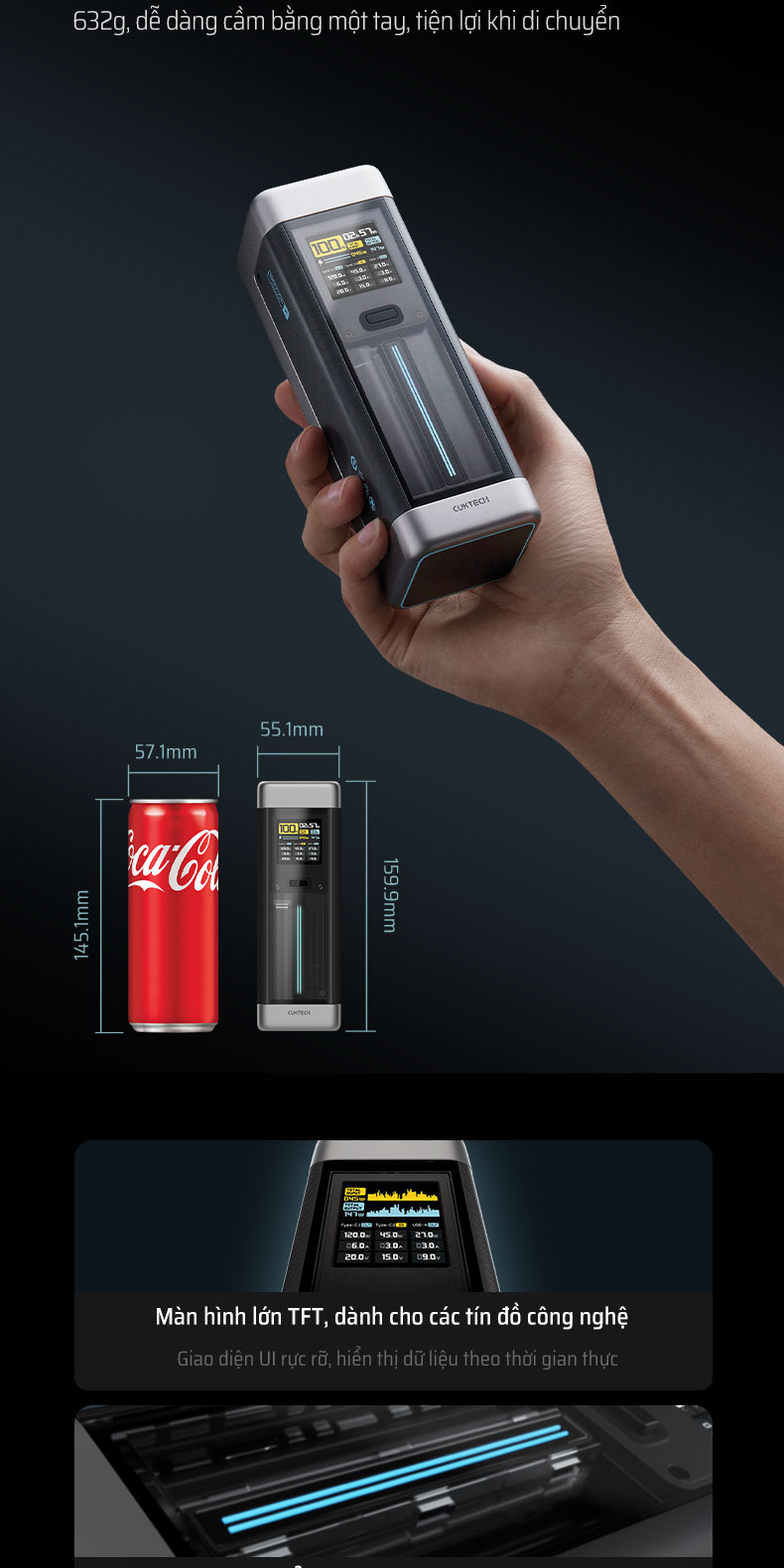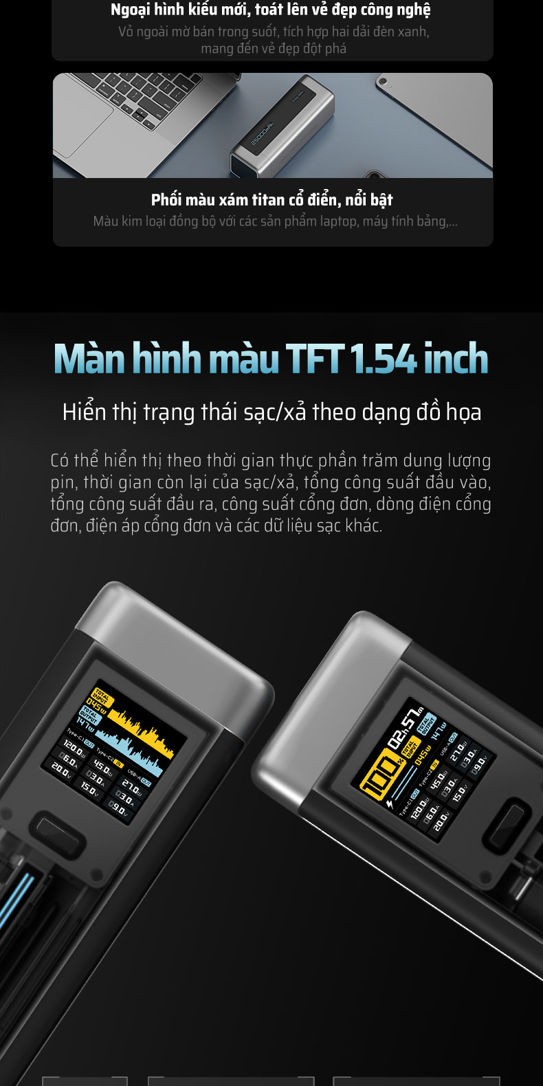 | Màn hình hiển thị | TFT 1.54 inch, hiển thị dung lượng, công suất, điện áp, dòng điện theo thời gian thực |