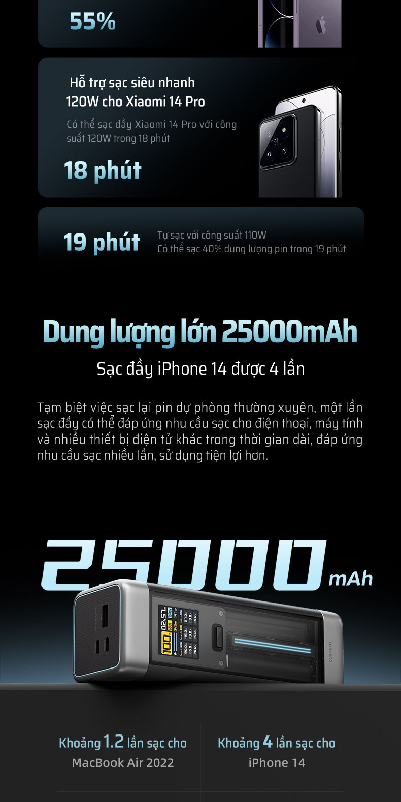 Sở hữu dung lượng lên đến 25.000mAh, CUKTECH P23 đáp ứng hoàn hảo nhu cầu sạc nhiều thiết bị cùng lúc. Bạn có thể sạc MacBook Air khoảng 1,2 lần hoặc iPhone 15 lên đến 4 lần chỉ với một lần nạp đầy pin sạc dự phòng.