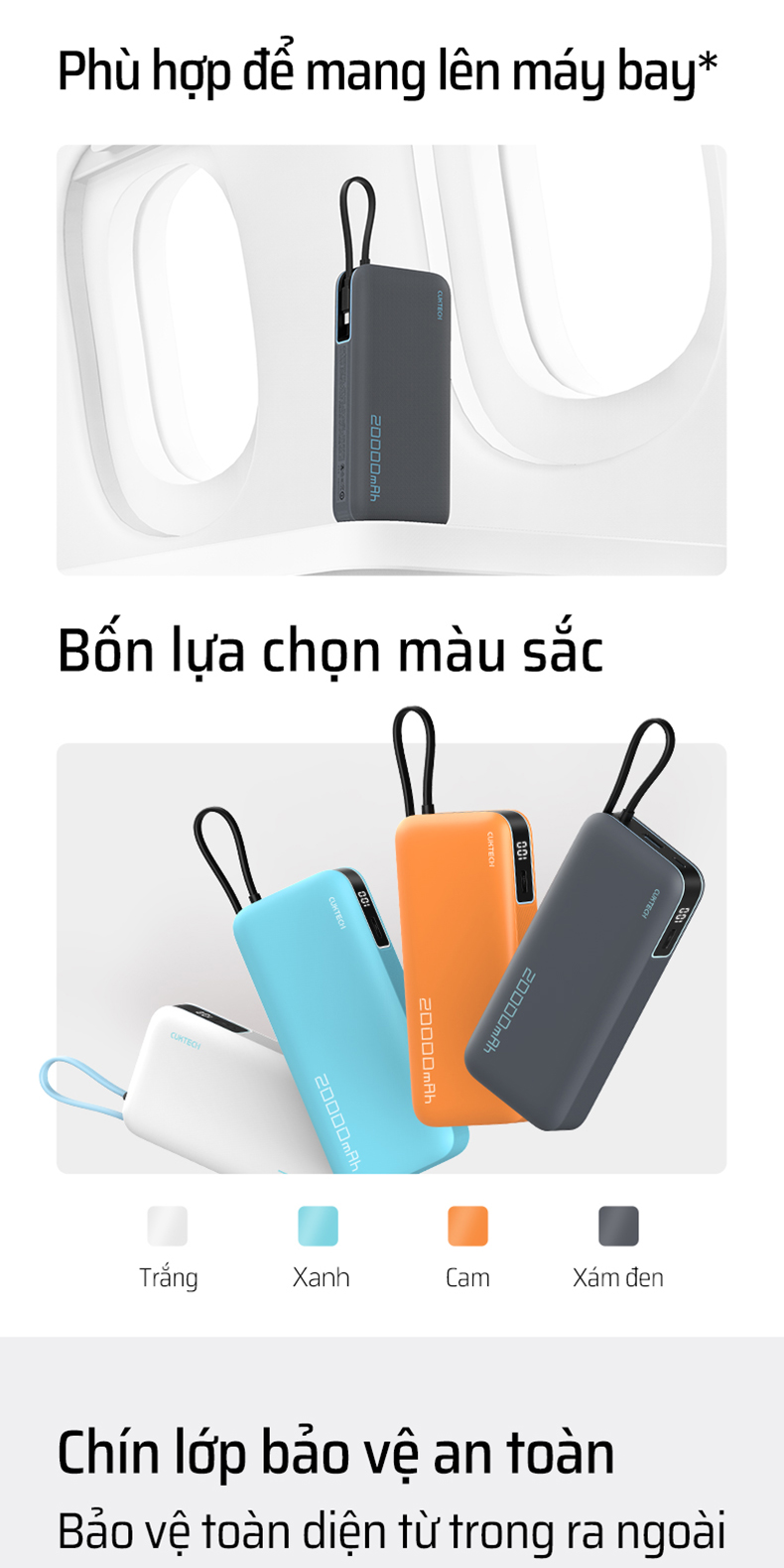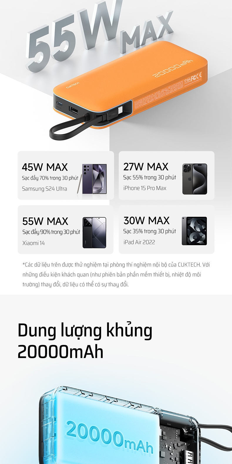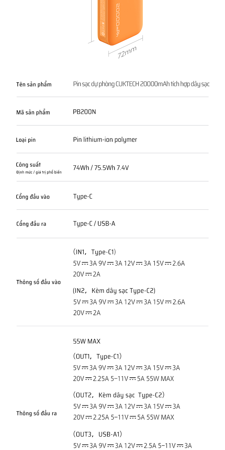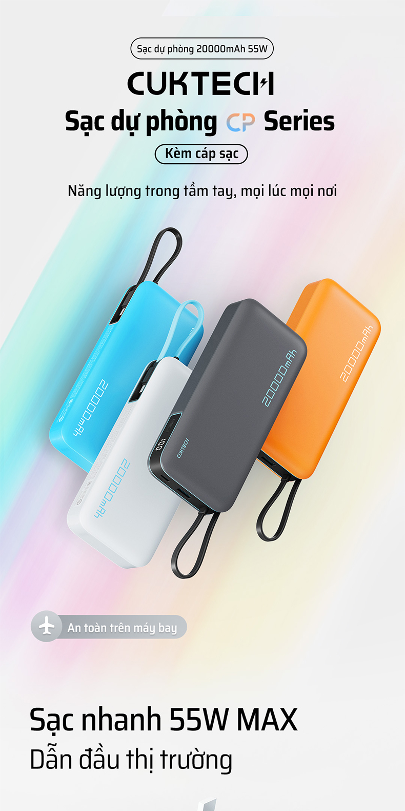 CUKTECH PB200N Pin sạc dự phòng 20000mAh 55W là thiết bị lưu trữ năng lượng di động hiện đại, được thiết kế để đáp ứng nhu cầu sạc nhanh và an toàn cho nhiều loại thiết bị khác nhau. Với dung lượng lớn 20.000mAh cùng công suất sạc tối đa 55W, sản phẩm không chỉ phù hợp cho điện thoại thông minh mà còn có thể sạc cả máy tính bảng, laptop mỏng nhẹ như MacBook Air. Đây là lựa chọn lý tưởng cho người dùng thường xuyên di chuyển, công tác xa hoặc cần nguồn điện dự phòng ổn định.