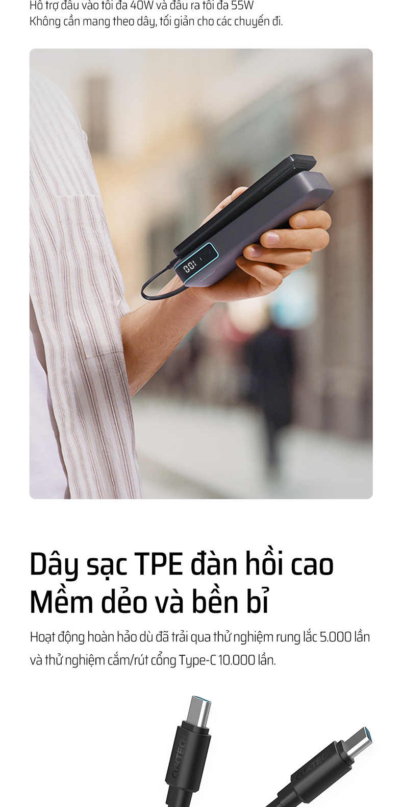 Khác biệt của CUKTECH PB200N nằm ở thiết kế thông minh với cáp USB-C tích hợp sẵn. Người dùng sẽ không còn phải loay hoay tìm dây sạc hay lo lắng về tình trạng rối dây khi di chuyển. Cáp này hỗ trợ công suất tối đa 45W, có thể sử dụng trực tiếp để sạc nhanh cho điện thoại hoặc laptop.