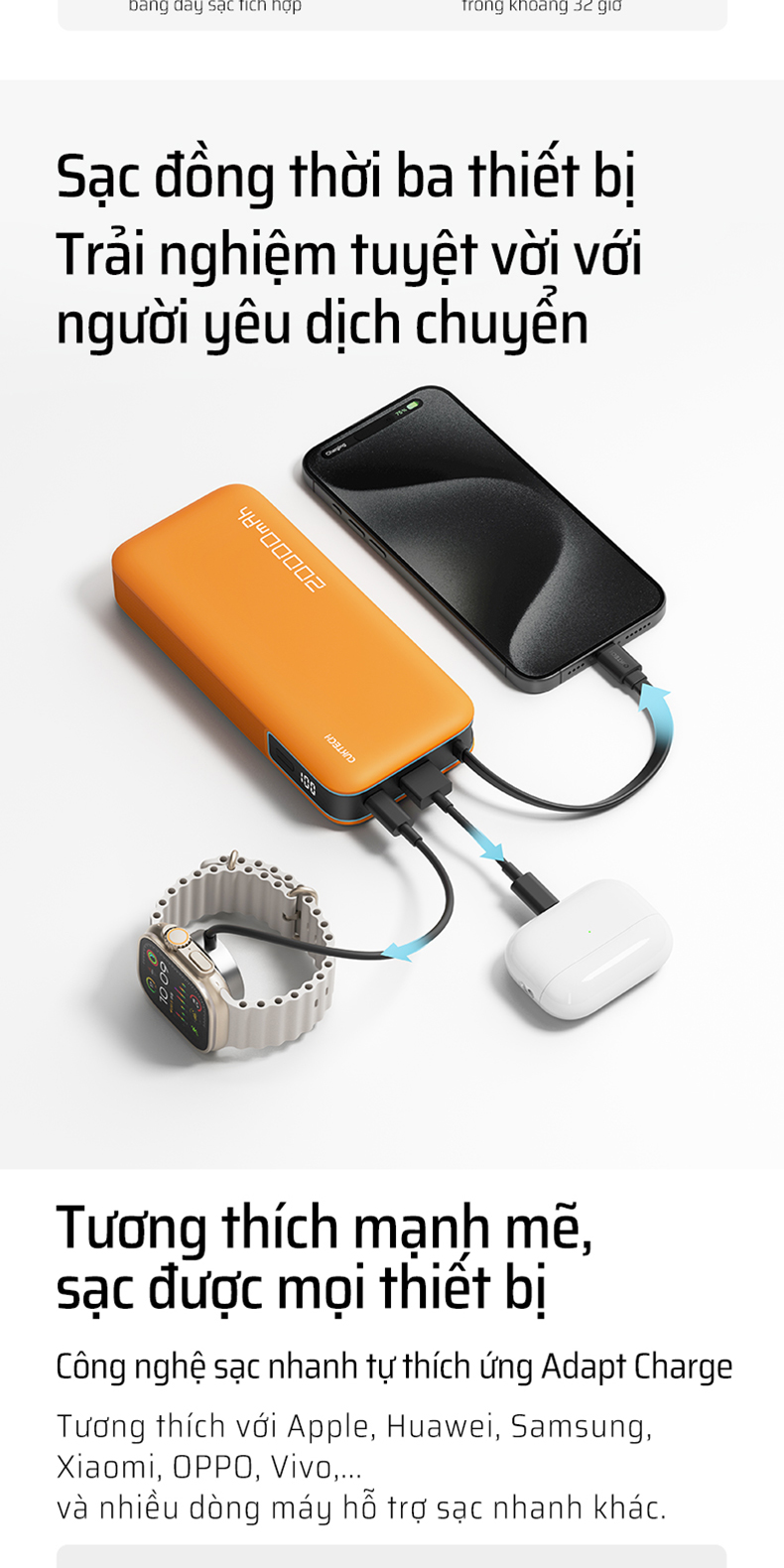 Không chỉ dừng lại ở điện thoại, pin sạc CUKTECH PB200N còn có thể đáp ứng nhu cầu năng lượng của MacBook Air, iPhone 15 Pro Max và nhiều thiết bị khác. Điều này mang đến sự tiện lợi đặc biệt cho người bận rộn, cần sạc nhanh chóng để tiếp tục công việc hoặc giải trí. Thay vì phải chờ đợi hàng giờ đồng hồ, bạn có thể yên tâm rằng chỉ trong vài chục phút, thiết bị của mình đã sẵn sàng để sử dụng. Đây là một lợi thế mà ít dòng pin sạc 20000mAh trên thị trường có thể đáp ứng được.