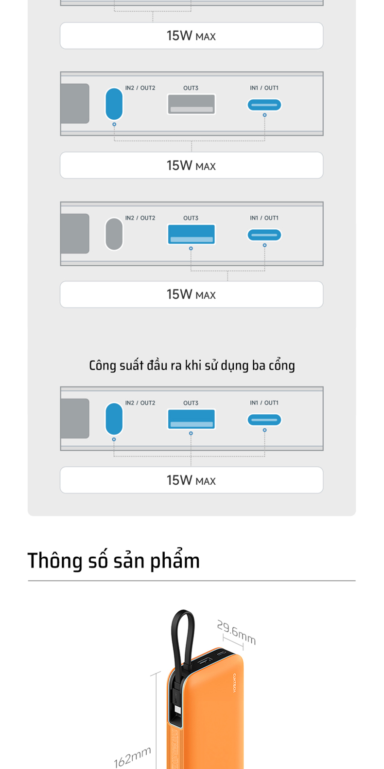 | Số cổng kết nối | 2 × Type-C (hỗ trợ In/Out), 1 × USB-A |