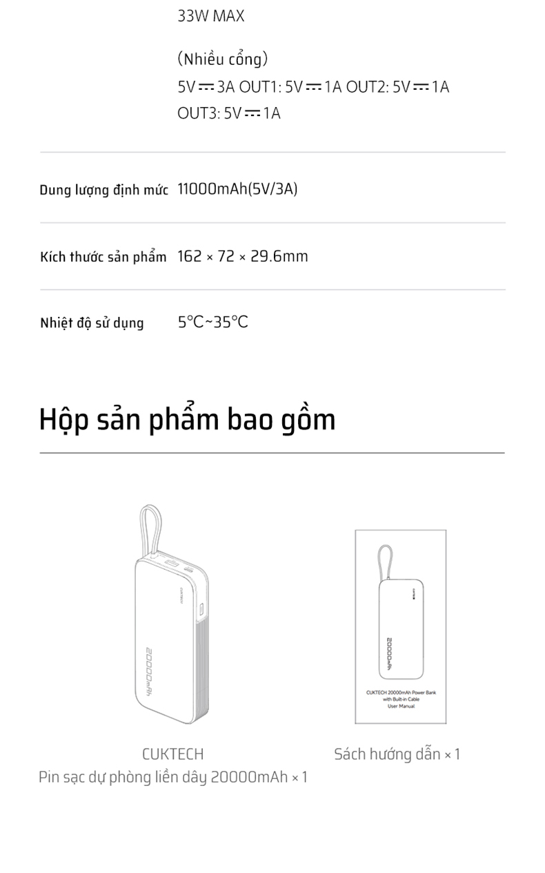 | Sạc đa thiết bị (Multi-port) | 5V=3A (chia đều: OUT1=5V/1A, OUT2=5V/1A, OUT3=5V/1A) |