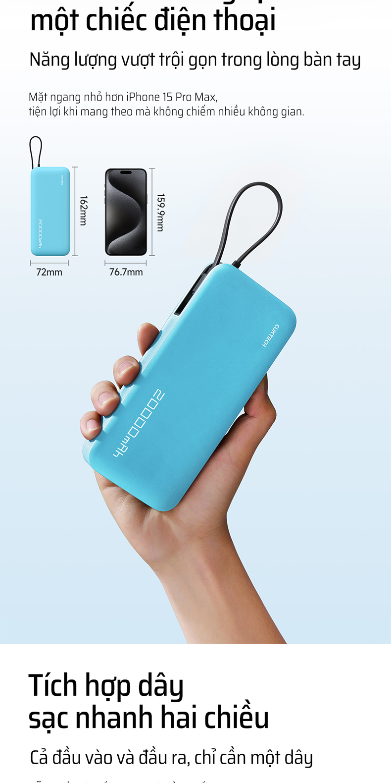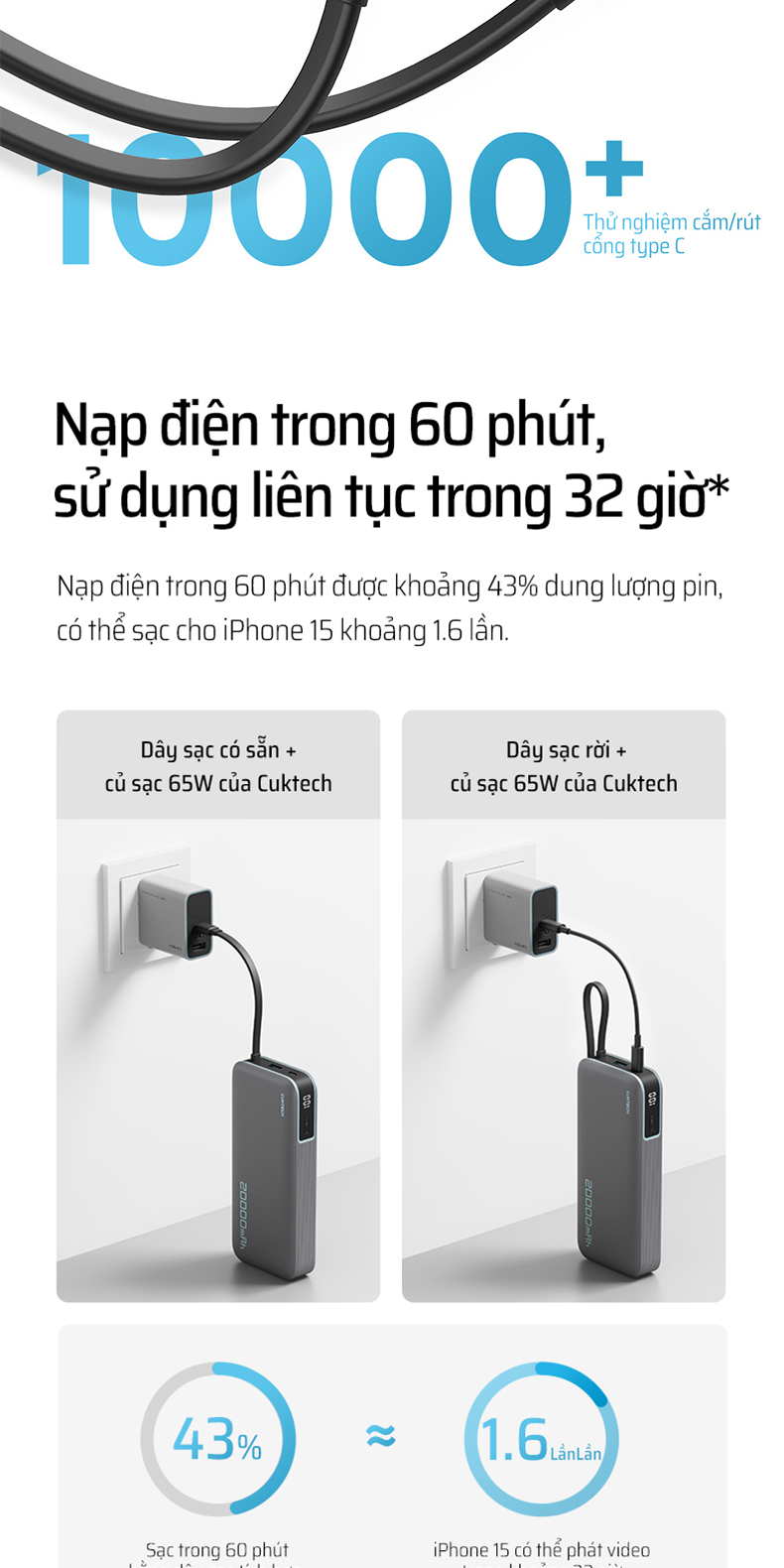 | Cáp sạc tích hợp | USB-C Built-in, công suất 45W, chịu được 10.000 lần gập, kiêm dây đeo |