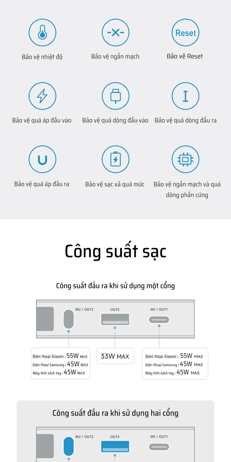 | Đầu ra (Output) | – OUT1 (Type-C1): 5V=3A / 9V=3A / 12V=3A / 15V=3A / 20V=2.25A / 5-11V=5A (55W Max)– OUT2 (Type-C2): 5V=3A / 9V=3A / 12V=3A / 15V=3A / 20V=2.25A / 5-11V=5A (55W Max)