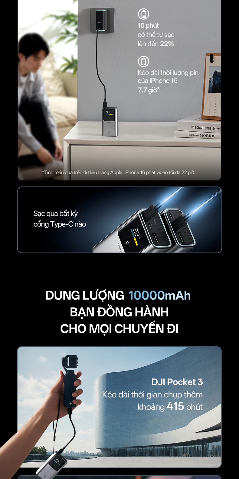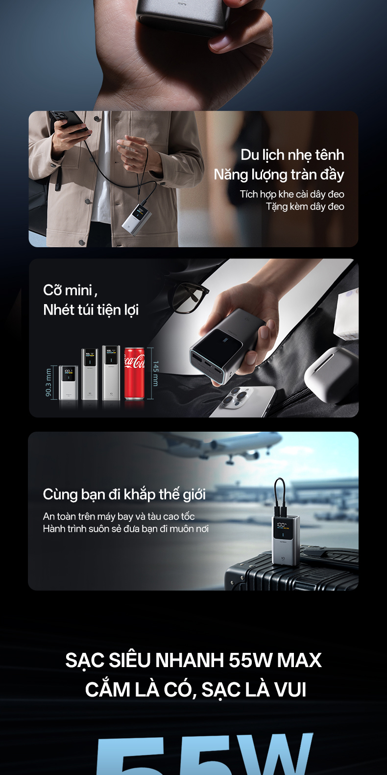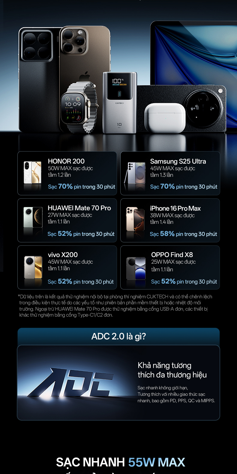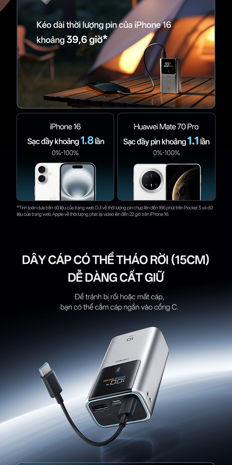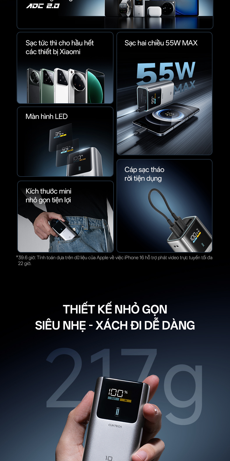 Hoàn cảnh thực tế: Nếu bạn là doanh nhân phải di chuyển liên tục, việc giữ điện thoại, laptop hay tablet đầy pin là cần thiết để duy trì liên lạc và xử lý công việc. Với Cuktech PB1055, bạn sẽ không còn lo lắng về việc thời gian sạc quá lâu, mọi thiết bị đều sẵn sàng khi cần.
