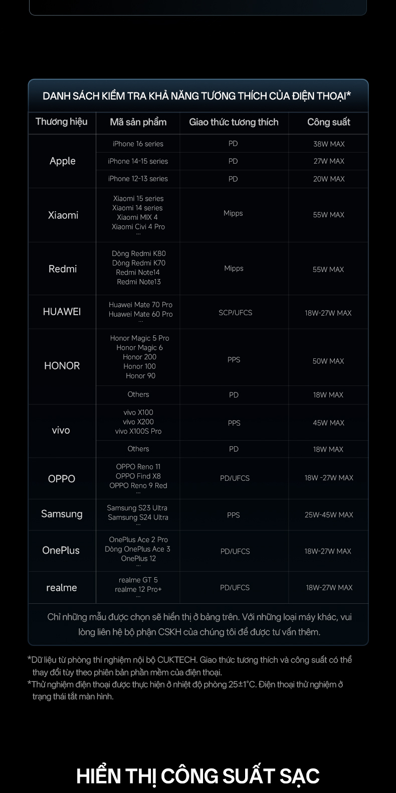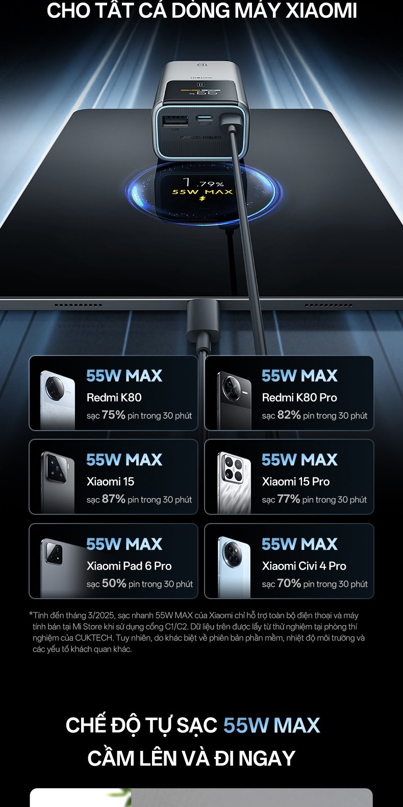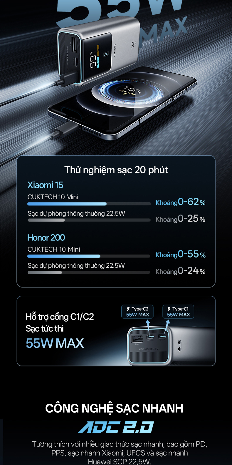Một trong những ưu điểm nổi bật nhất của Cuktech PB1055 là khả năng sạc nhanh 55W. Sản phẩm tương thích với nhiều chuẩn sạc: PD (Power Delivery), PPS (Programmable Power Supply), QC (Quick Charge) và Mi Turbo. Nhờ đó, bạn có thể sạc đầy điện thoại chỉ trong 1–1,5 giờ, tiết kiệm đáng kể thời gian chờ đợi.