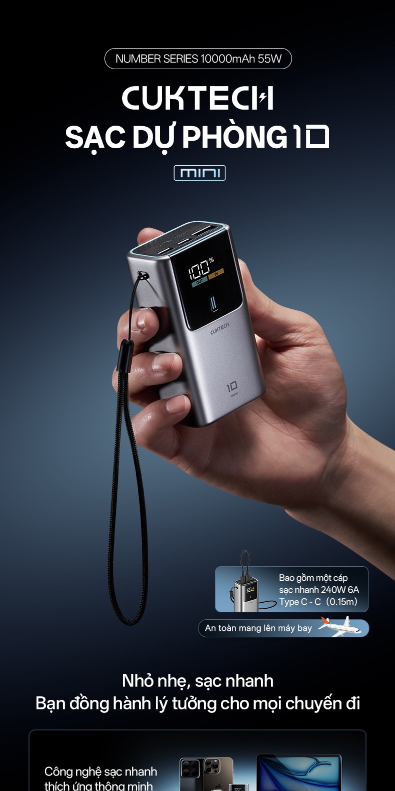 Với Pin dự phòng Mini Cuktech PB1055 10.000mAh 55W, bạn sẽ trải nghiệm sạc nhanh – tiện lợi – an toàn – đa cổng mọi lúc, mọi nơi. Đừng để thiết bị hết pin làm gián đoạn công việc hay chuyến đi của bạn.