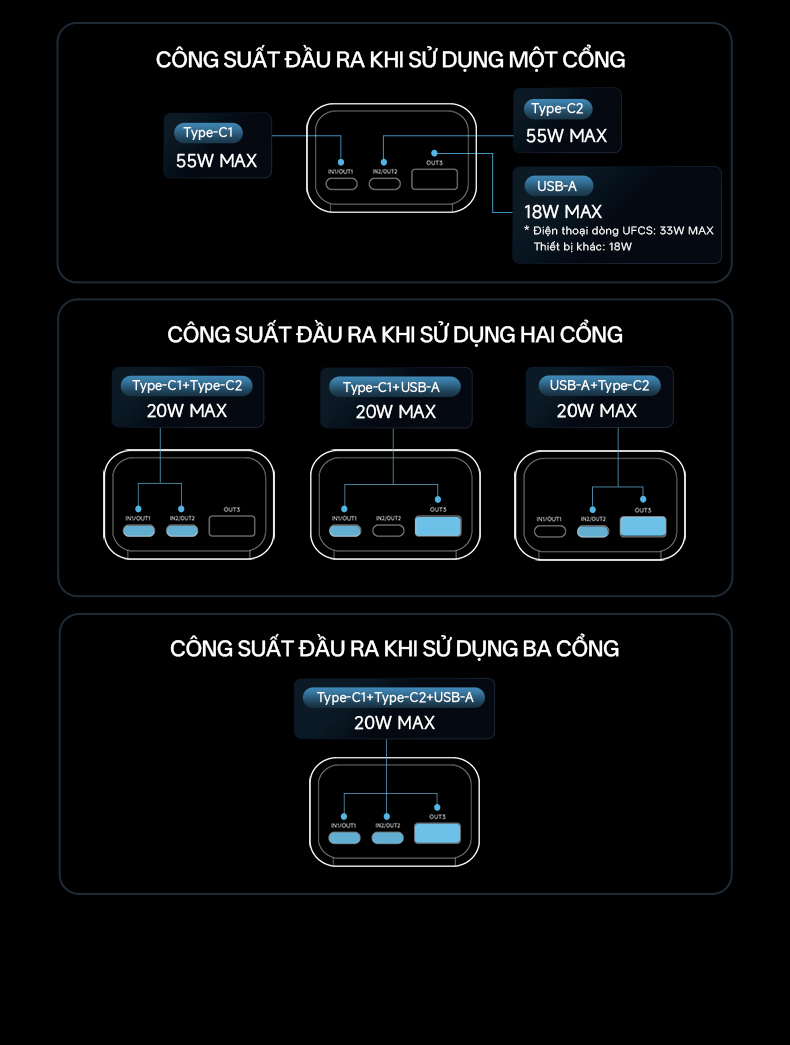 | Cổng ra (Output) | Type-C1, Type-C2, USB-A1 |